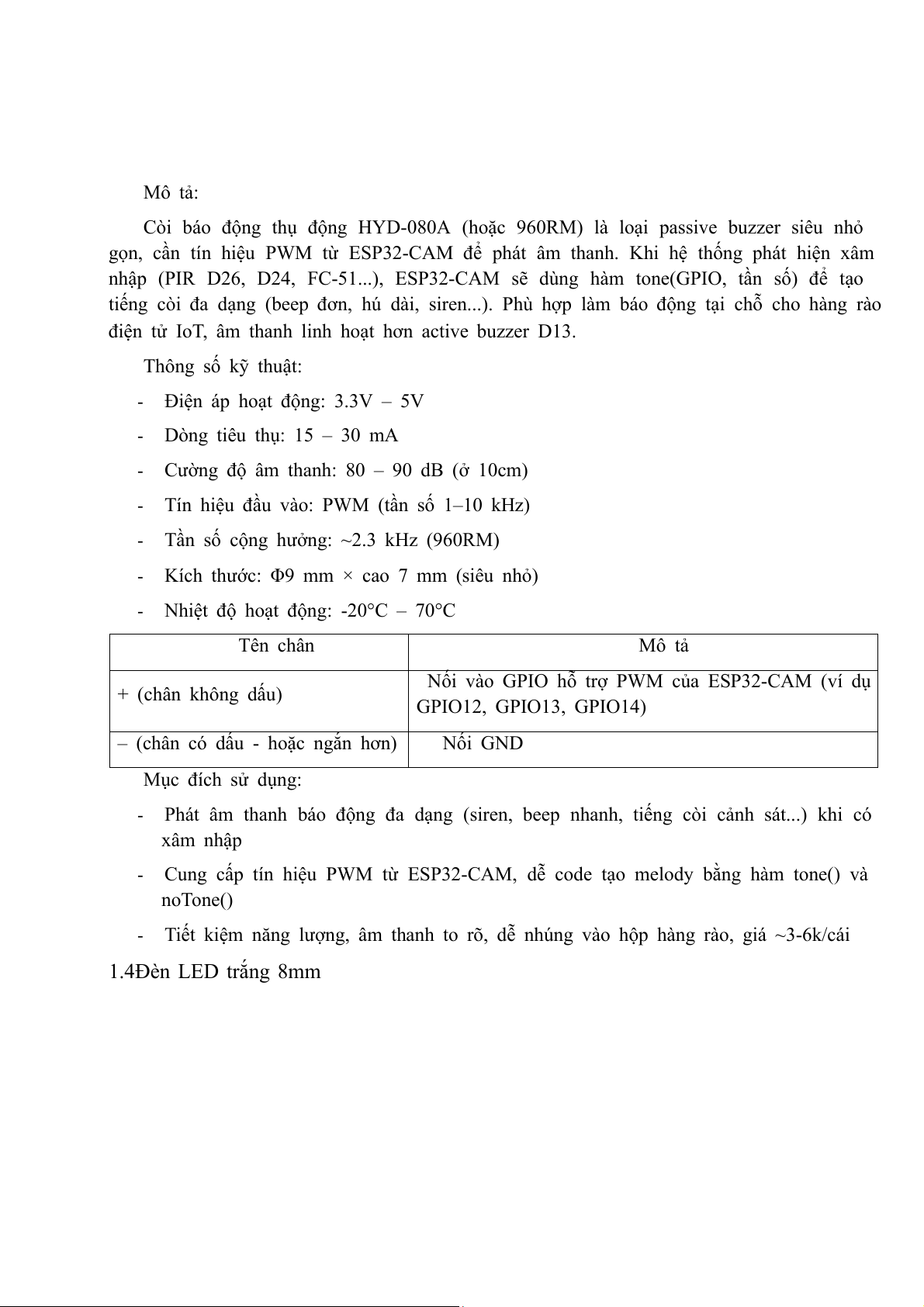 lý PIR D26, D24, FC-51, còi thụ động, LED trắng 8mm...). Thông số kỹ thuật: -