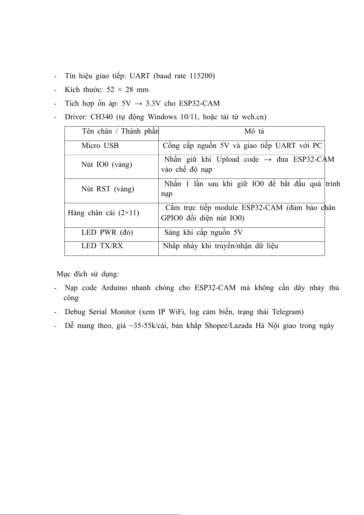 Driver: CH340 (tự động Windows 10/11, hoặc tải từ wch.cn) Tên chân / Thành phần Mô tả Micro USB
