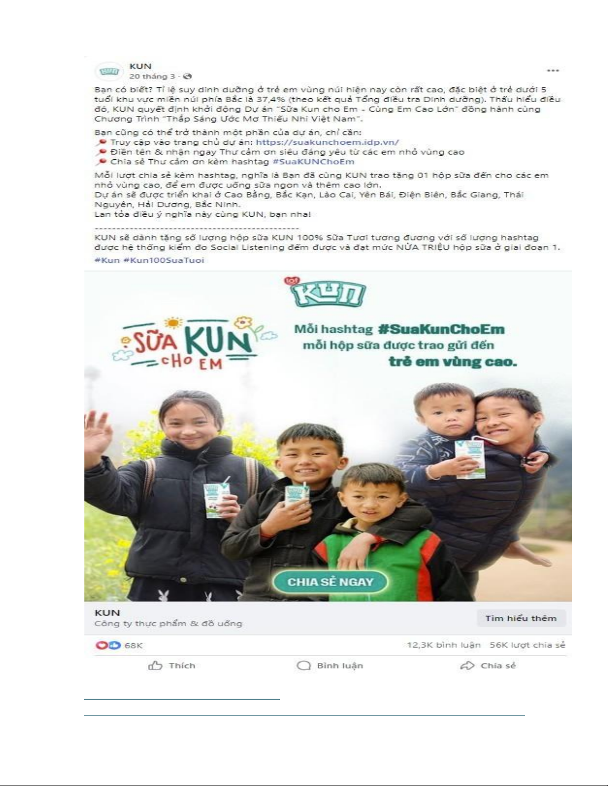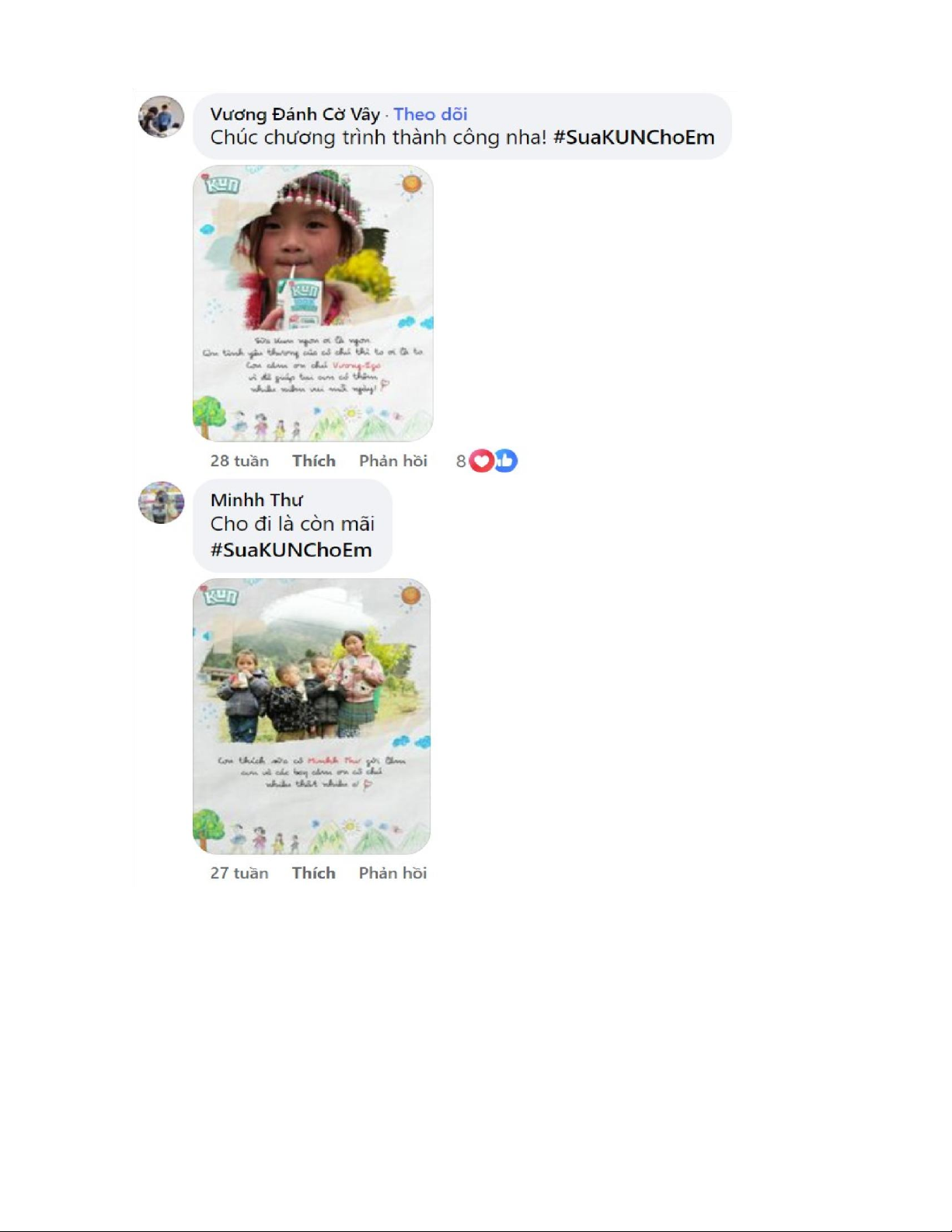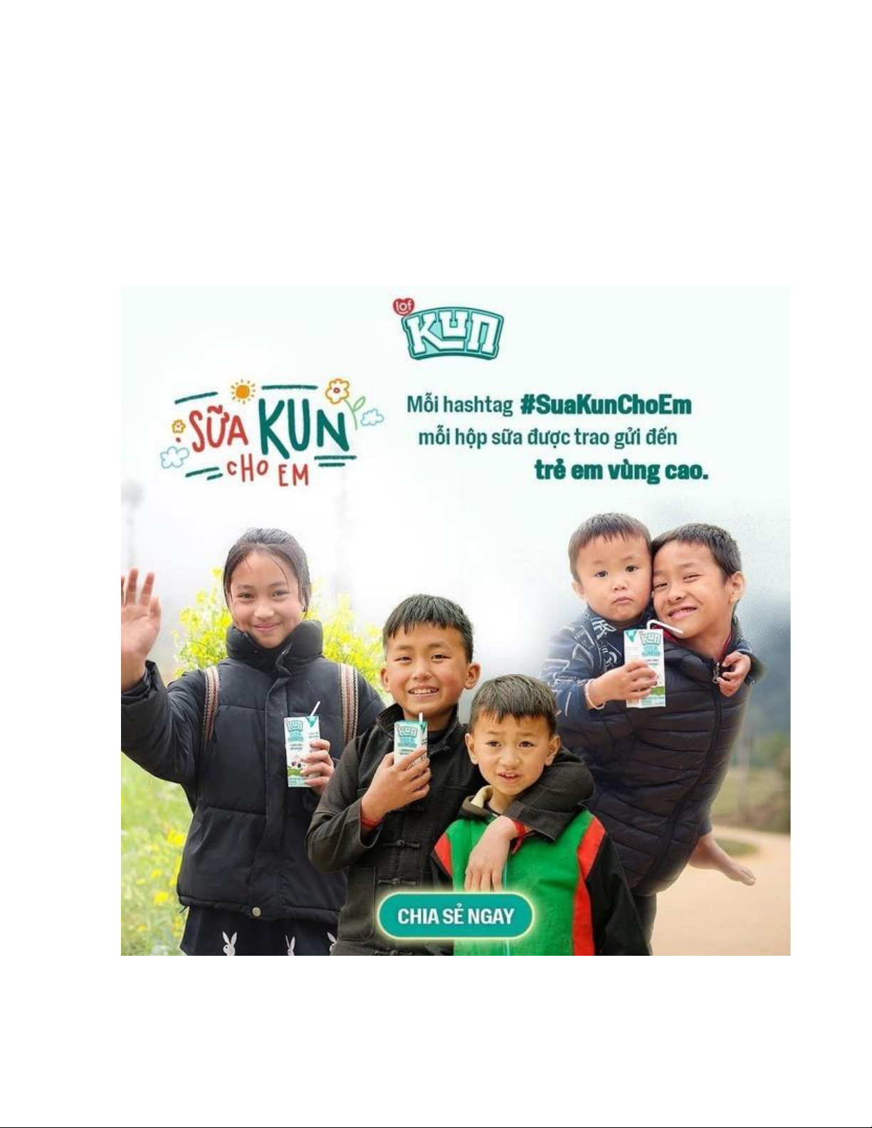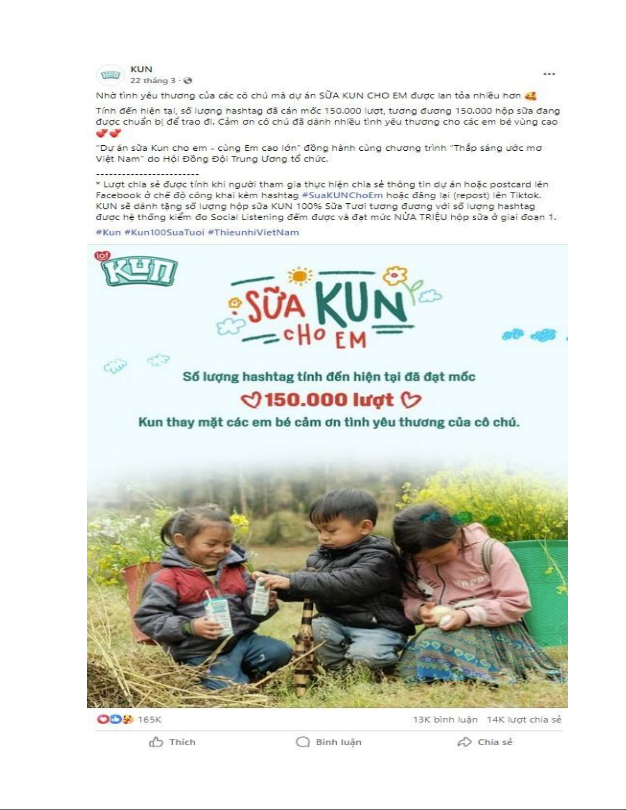 kèm hashtag #SuaKUNchoem để đóng góp một hộp sữa KUN gửi tới cho các em nhỏ ở vùng cao.