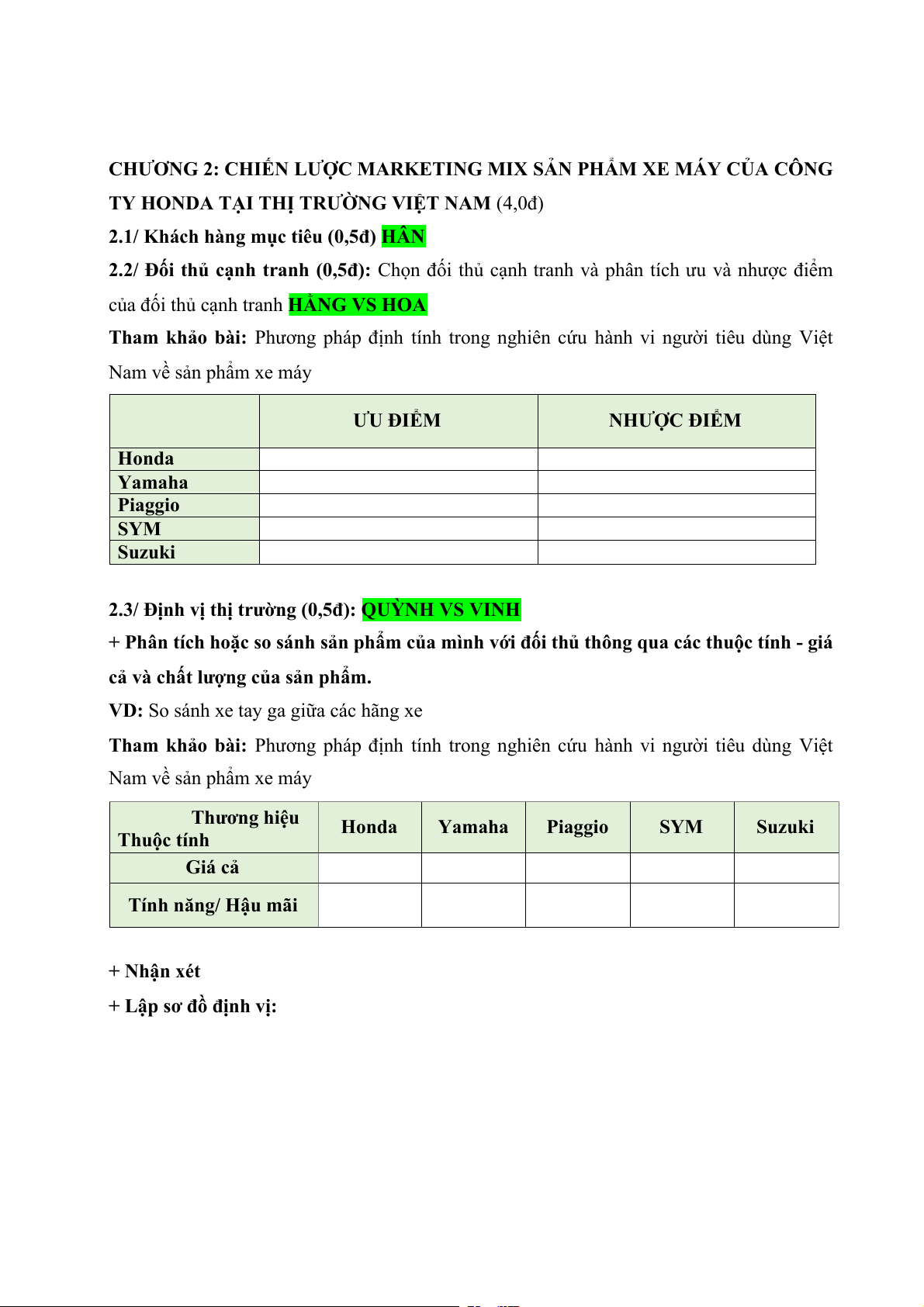 2.3/ Định vị thị trường (0,5đ): QUỲNH VS VINH