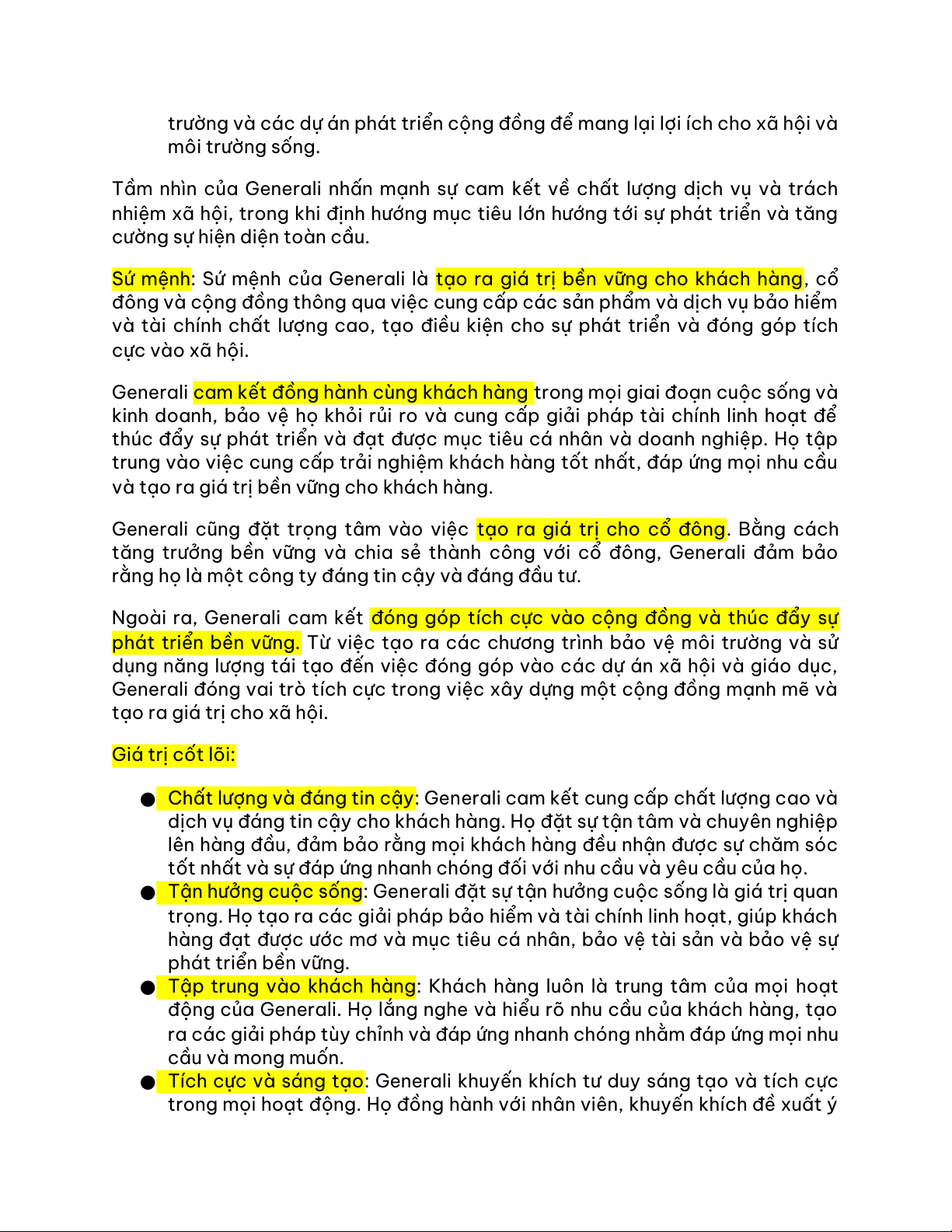 Sứ mệnh: Sứ mệnh của Generali là tạo ra giá trị bền vững cho khách hàng, cổ