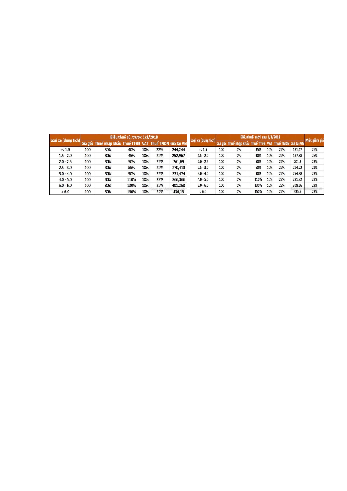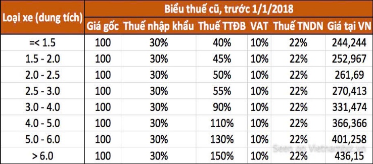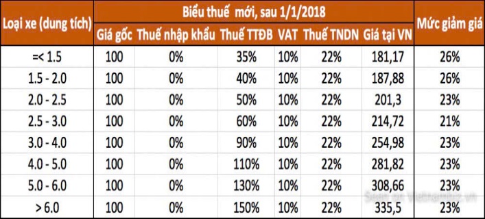 Hình 2: Biểu thuế của ô tô cá nhân Việt Nam trước và sau 1/1/2018
