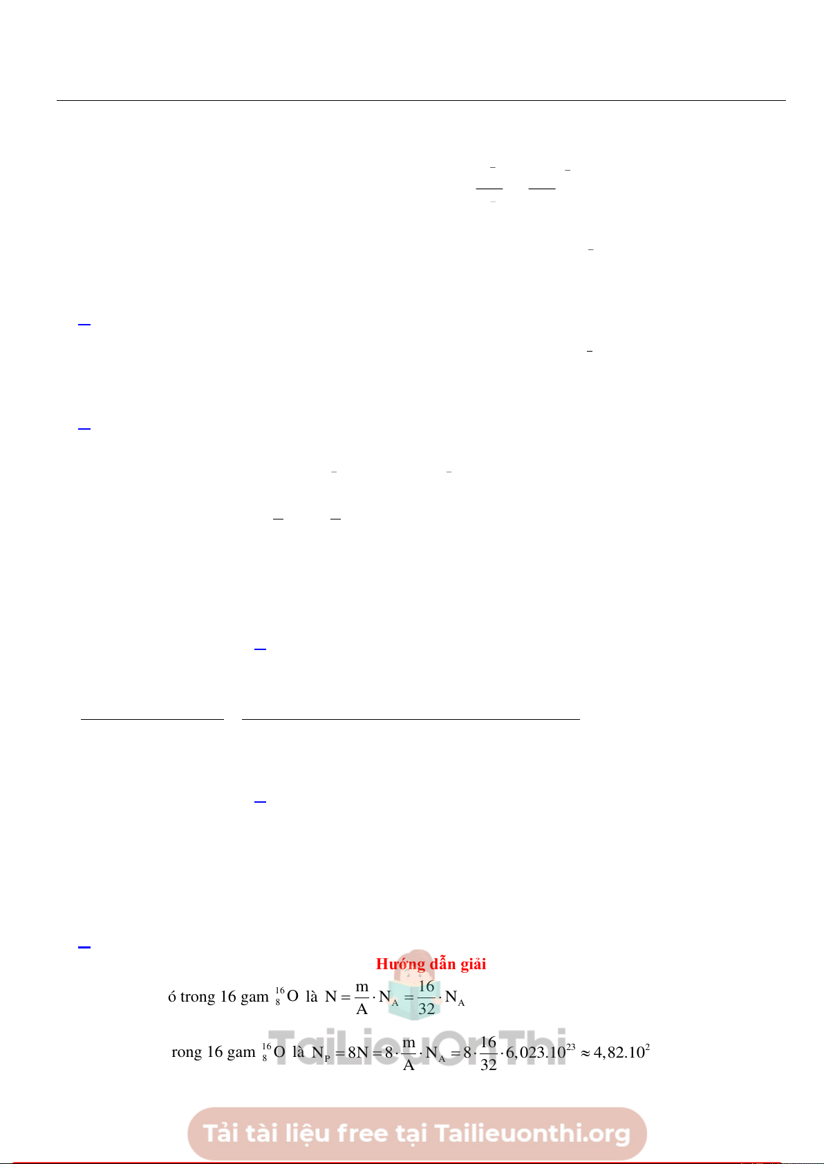 Số hạt U trong 119 gam là 23 N = = = = 3,01.10 hạt. 27 m 238u 238.1, 66055.10− U Số hạt proton 25 N = 92N 2, 77.10 hạt. p −