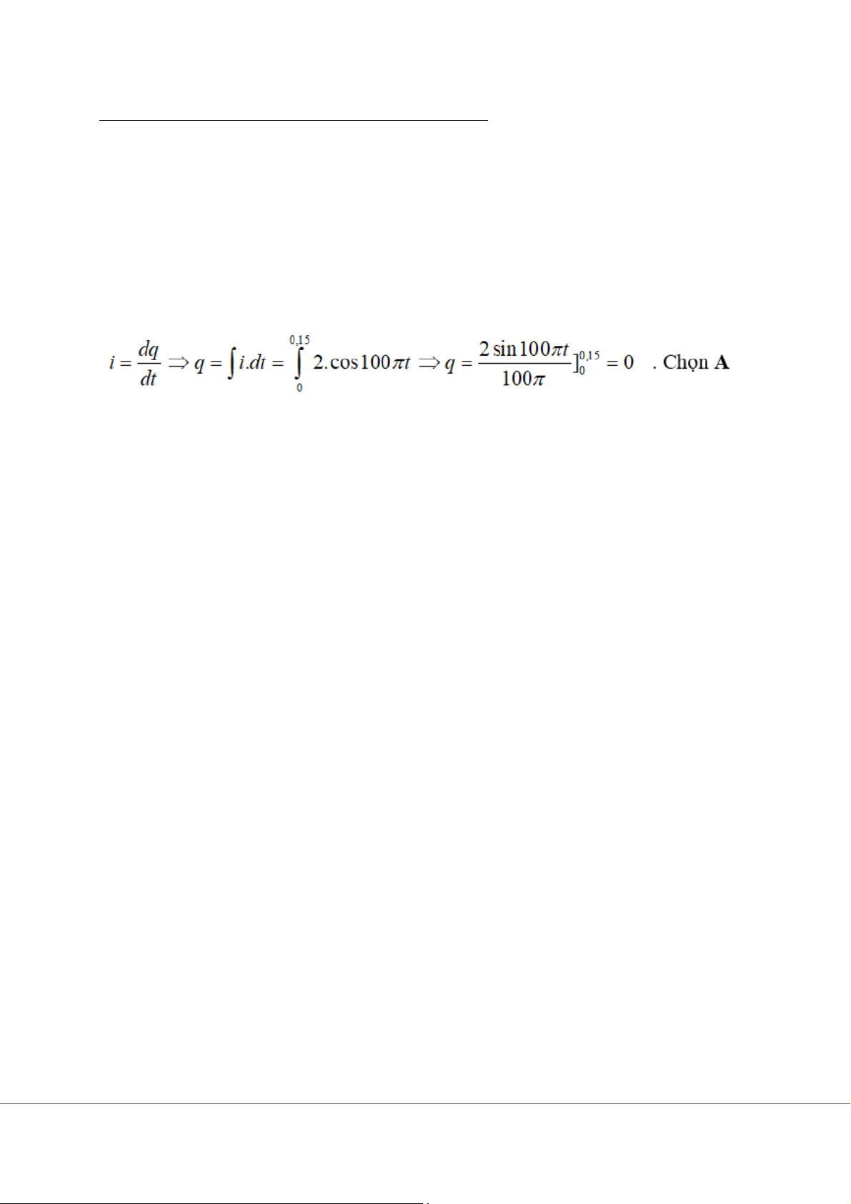 Câu 4. Dòng điện xoay chiều có biểu thức i = 2cos100πt (A) chạy qua dây dẫn.