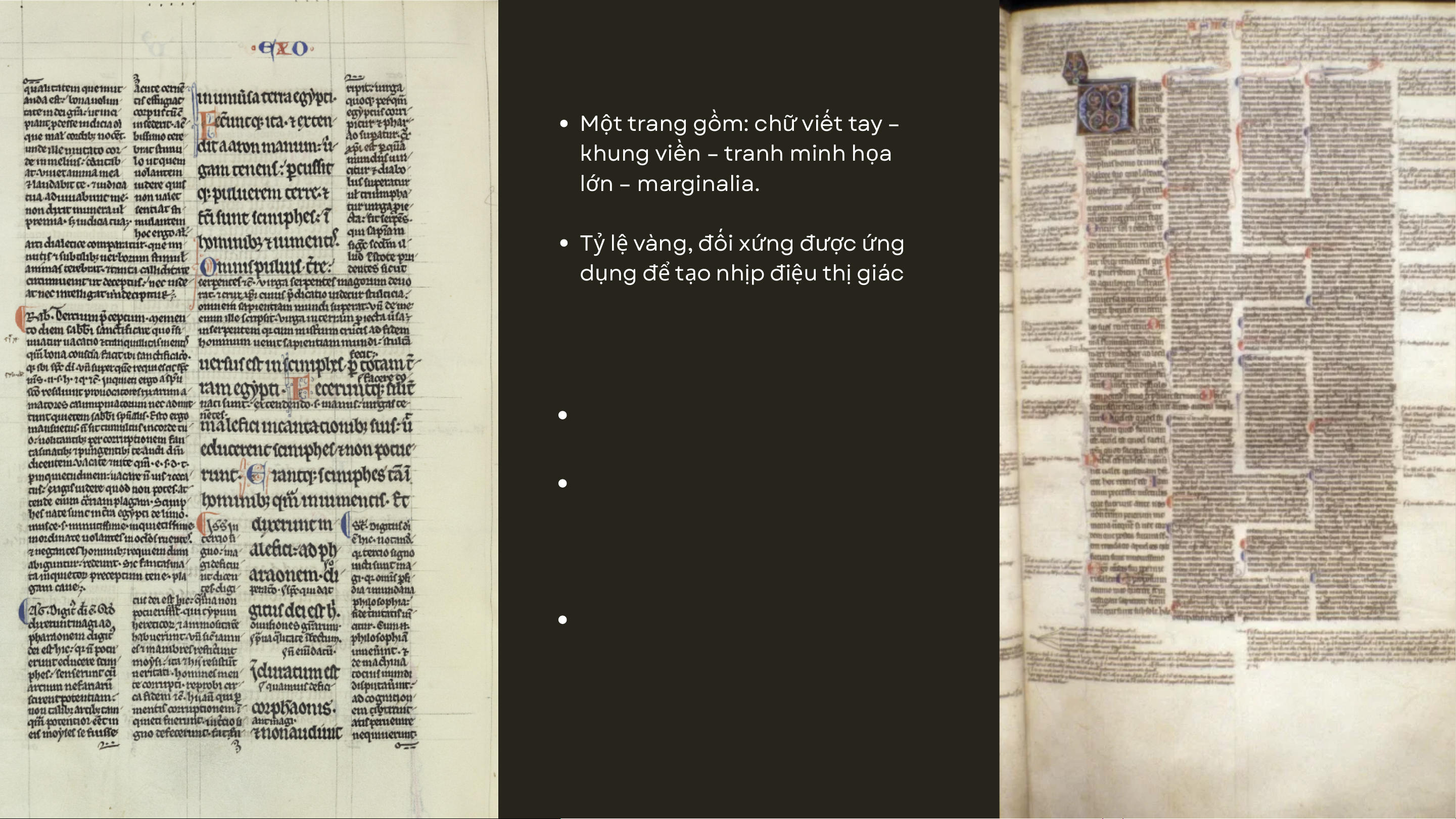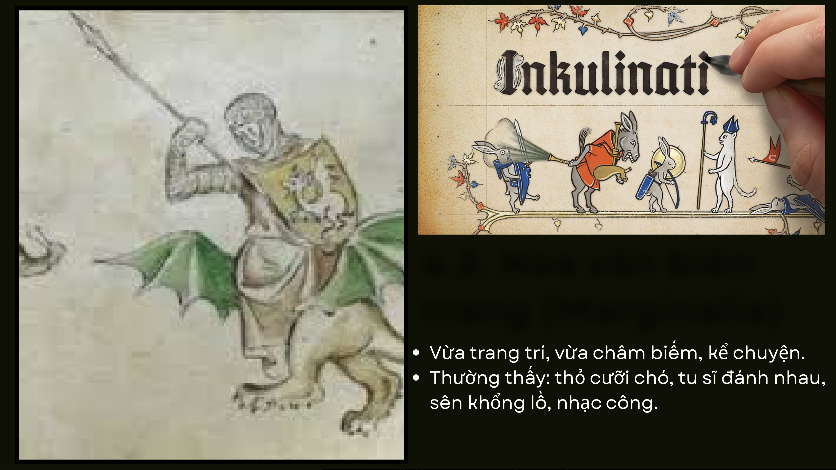Motif: dây leo, quái thú, hoa lá, hình người ẩn trong chữ. 4.2. Hoa văn biên trang (Marginalia)
