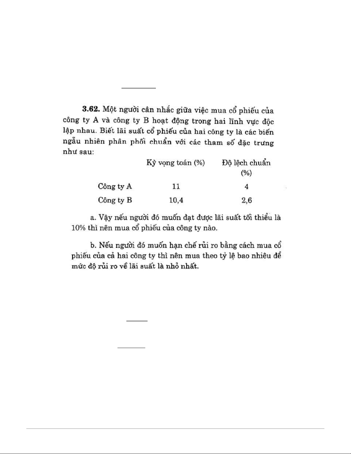 b/ f (x ) F == x ( ) (tra đạo hàm trong sách) (xa2 )2+ X= lãi suất công ty A Y= lãi suất công ty B P U 10 1 − 1 59.87% a/ P(X>10) = = 4 P U 10 1 − 0.4 56.11% P(Y>10) = = 2.6 Nên mua cp cty A b/ giả sử có 1 đồng 22:31, 27/01/2026