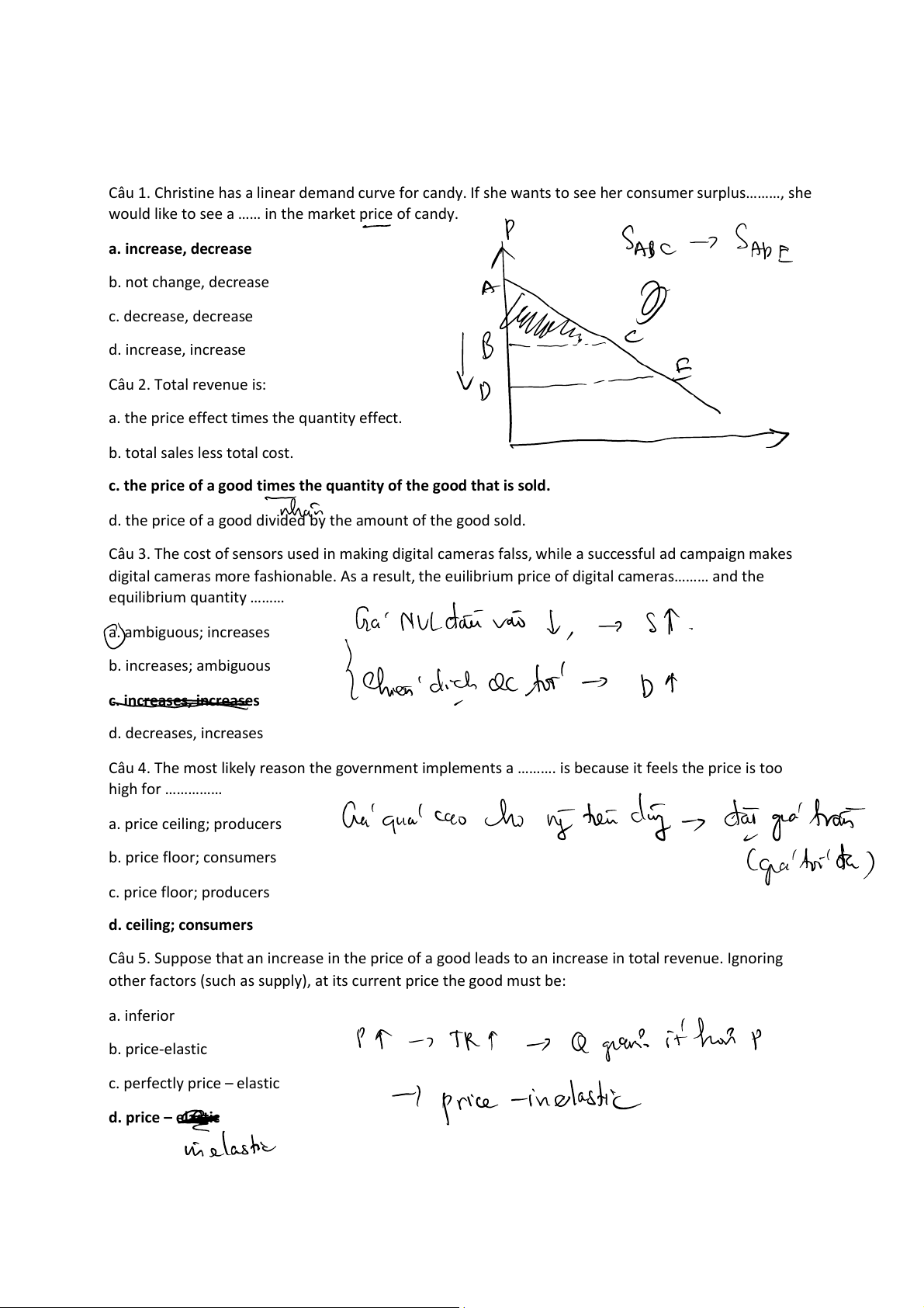 Câu 1. Christine has a linear demand curve for candy. If she wants to see her consumer surplus………, she