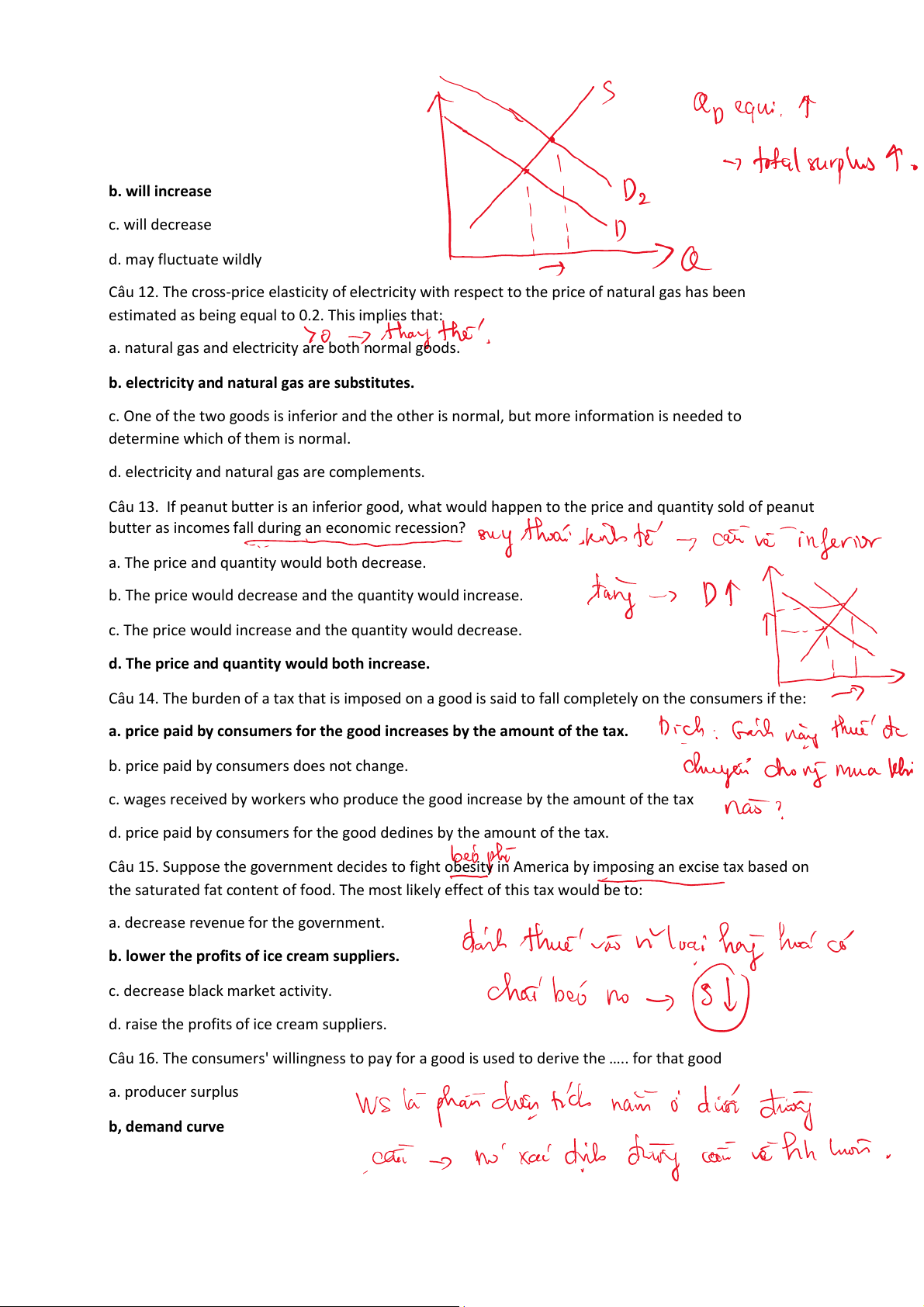 Câu 13. If peanut butter is an inferior good, what would happen to the price and quantity sold of peanut