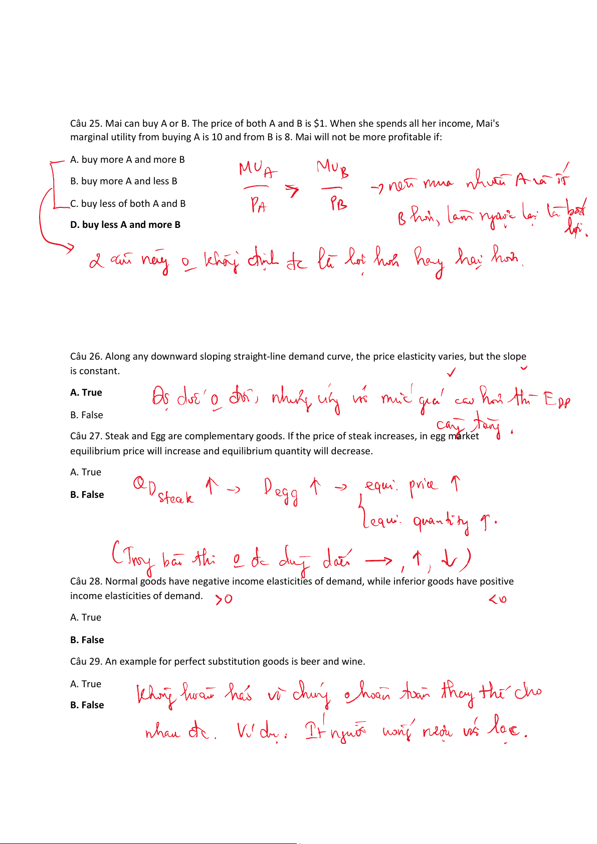 Câu 26. Along any downward sloping straight-line demand curve, the price elasticity varies, but the slope is constant. A. True B. False