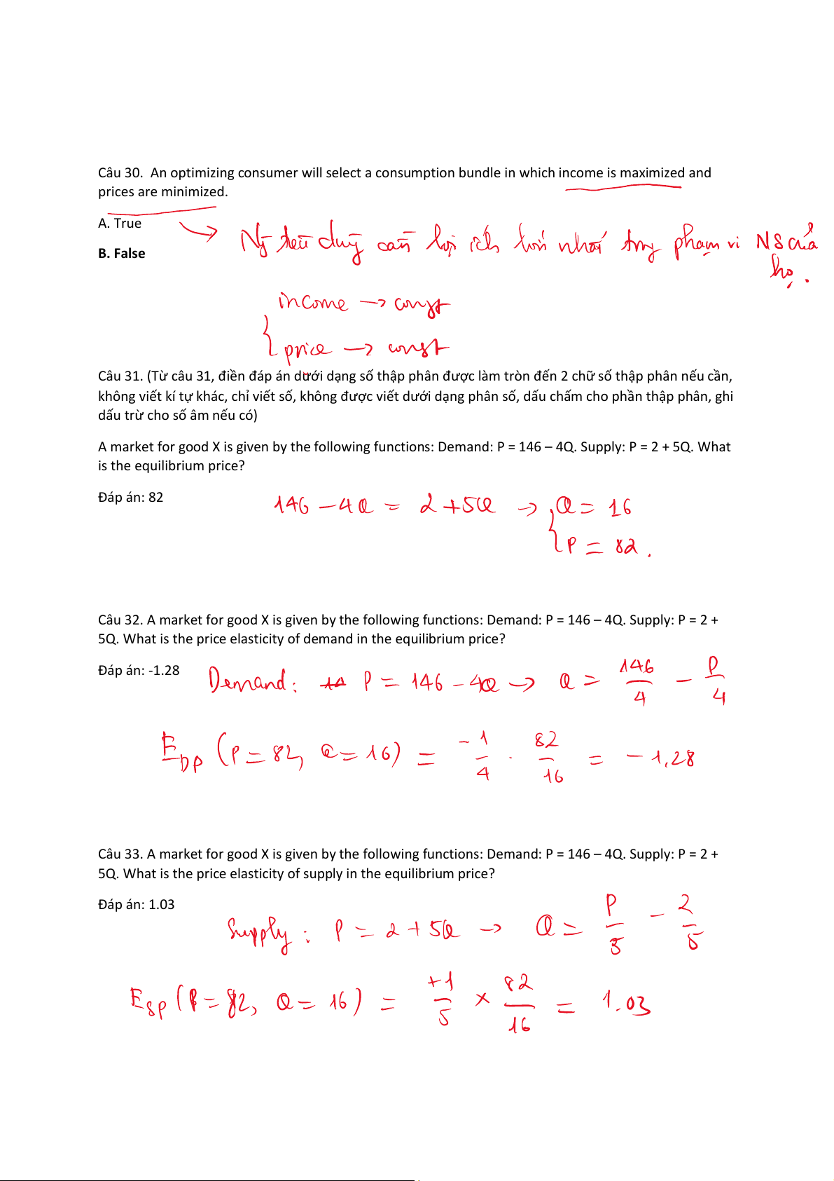 Câu 30. An optimizing consumer will select a consumption bundle in which income is maximized and prices are minimized. A. True B. False