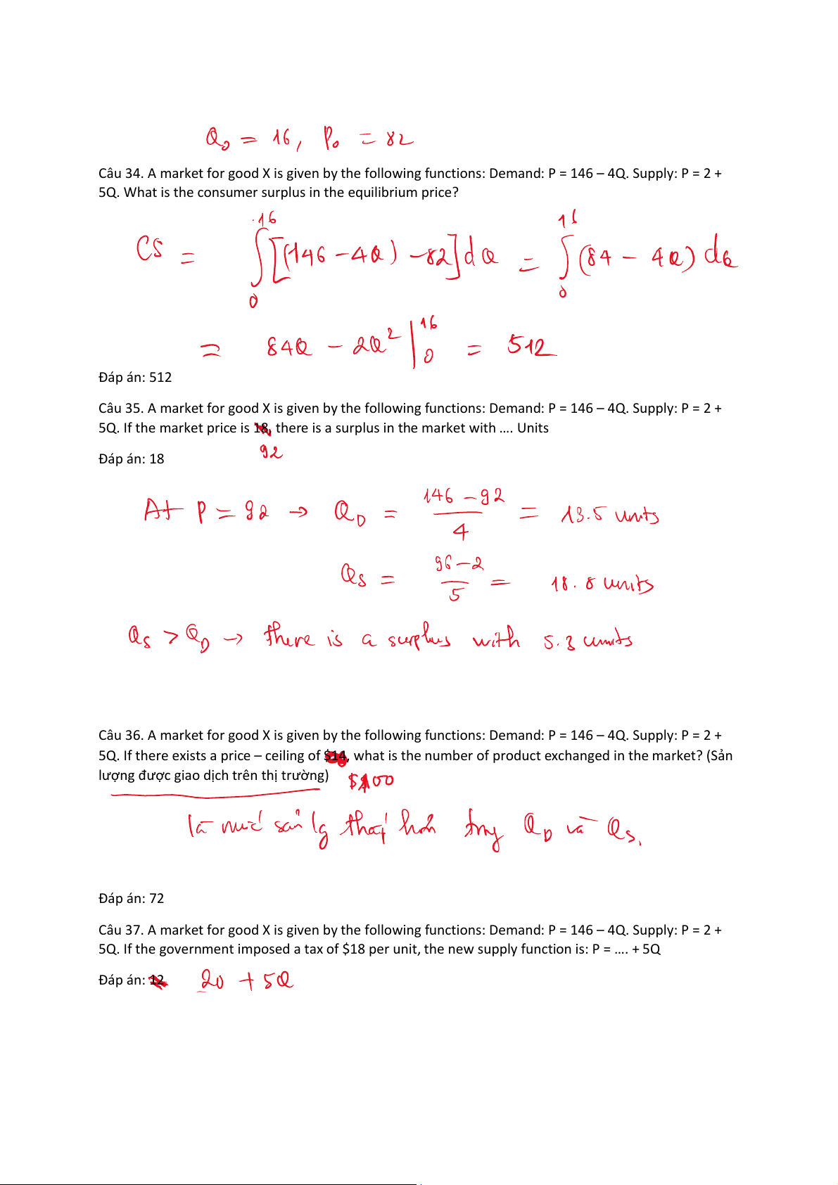 Câu 34. A market for good X is given by the following functions: Demand: P = 146 – 4Q. Supply: P = 2 +
