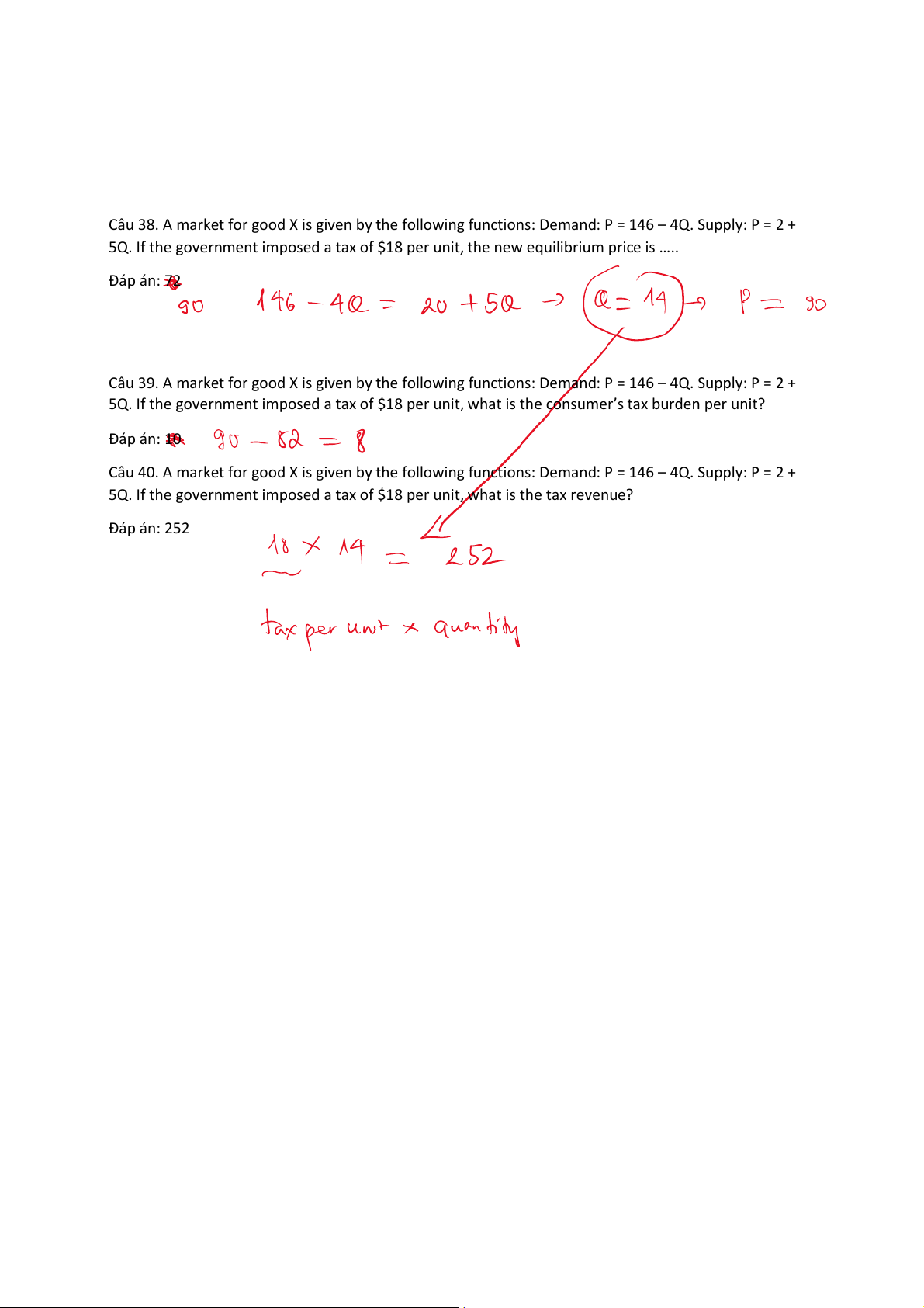 5Q. If the government imposed a tax of $18 per unit, what is the tax revenue? Đáp án: 252