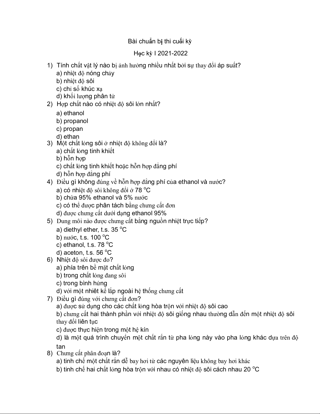 1) Tính chất vật lý nào bị ảnh hưởng nhiều nhất bởi sự thay đổi áp suất? a) nhiệt độ nóng chảy b) nhi ệt độ sôi c) chỉ số khúc xạ d) khối lượng phân tử