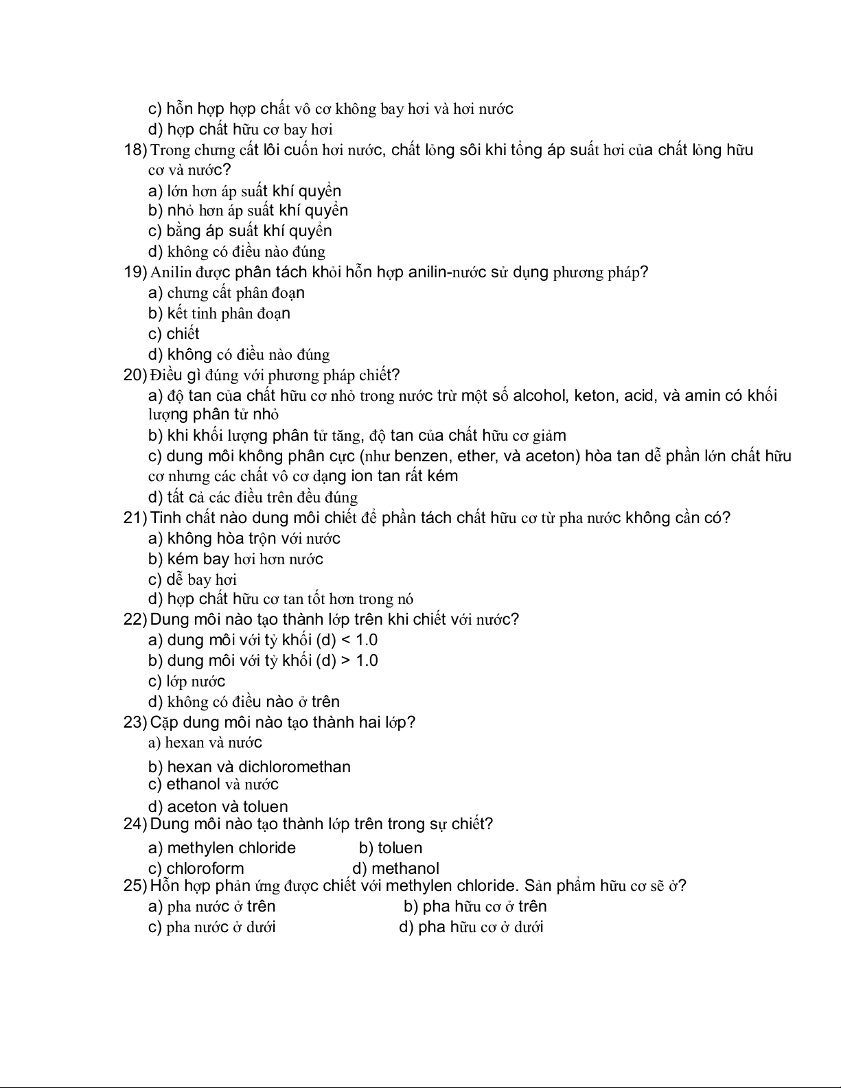 23) Cặp dung môi nào tạo thành hai lớp? a) hexan và nước b) hexan và dichloromethan c) ethanol và nước d) aceton và toluen