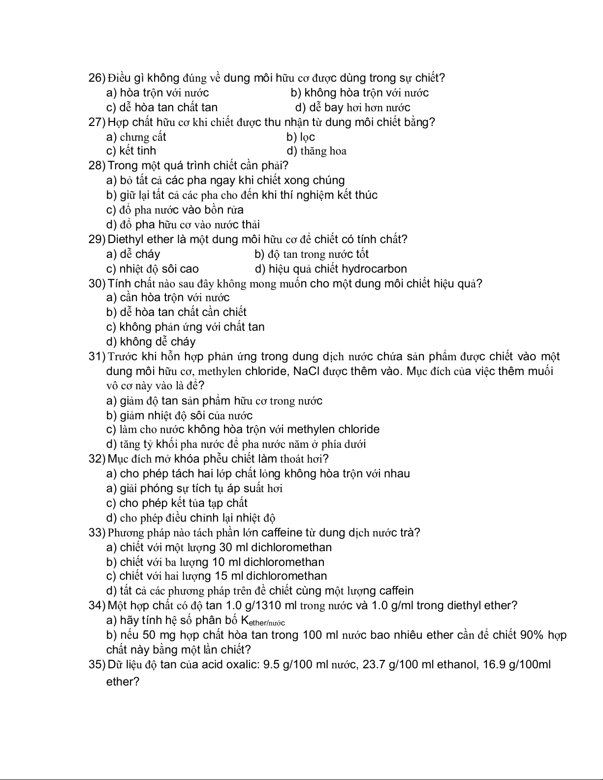 29) Diethyl ether là một dung môi hữu cơ để chiết có tính chất? a) dễ cháy b) độ c t tan trong nướ ốt c) nhiệt độ sôi cao