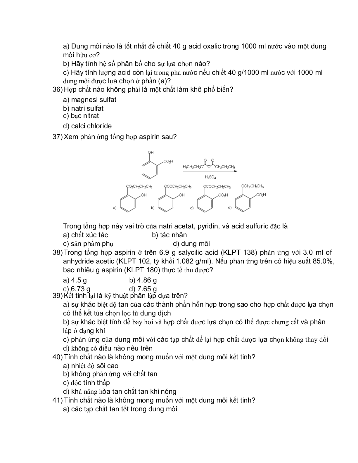 40) Tính chất nào là không mong muốn với một dung môi kết tinh? a) nhiệt độ sôi cao b) không phản ng ứ với chất tan c) c t độ ính thấp