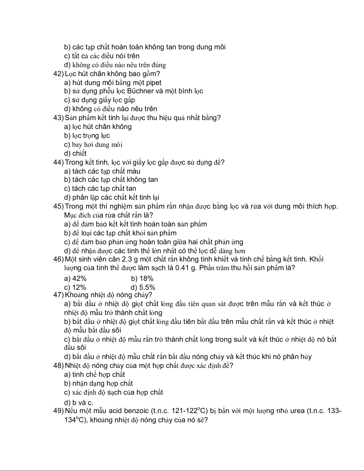 lượng của tinh thể được làm sạch là 0.41 g. Phần trăm thu hồi sản phẩm là? a) 42% b) 18% c) 12% d) 5.5% 47) Khoảng nhiệt nóng ch độ ảy?