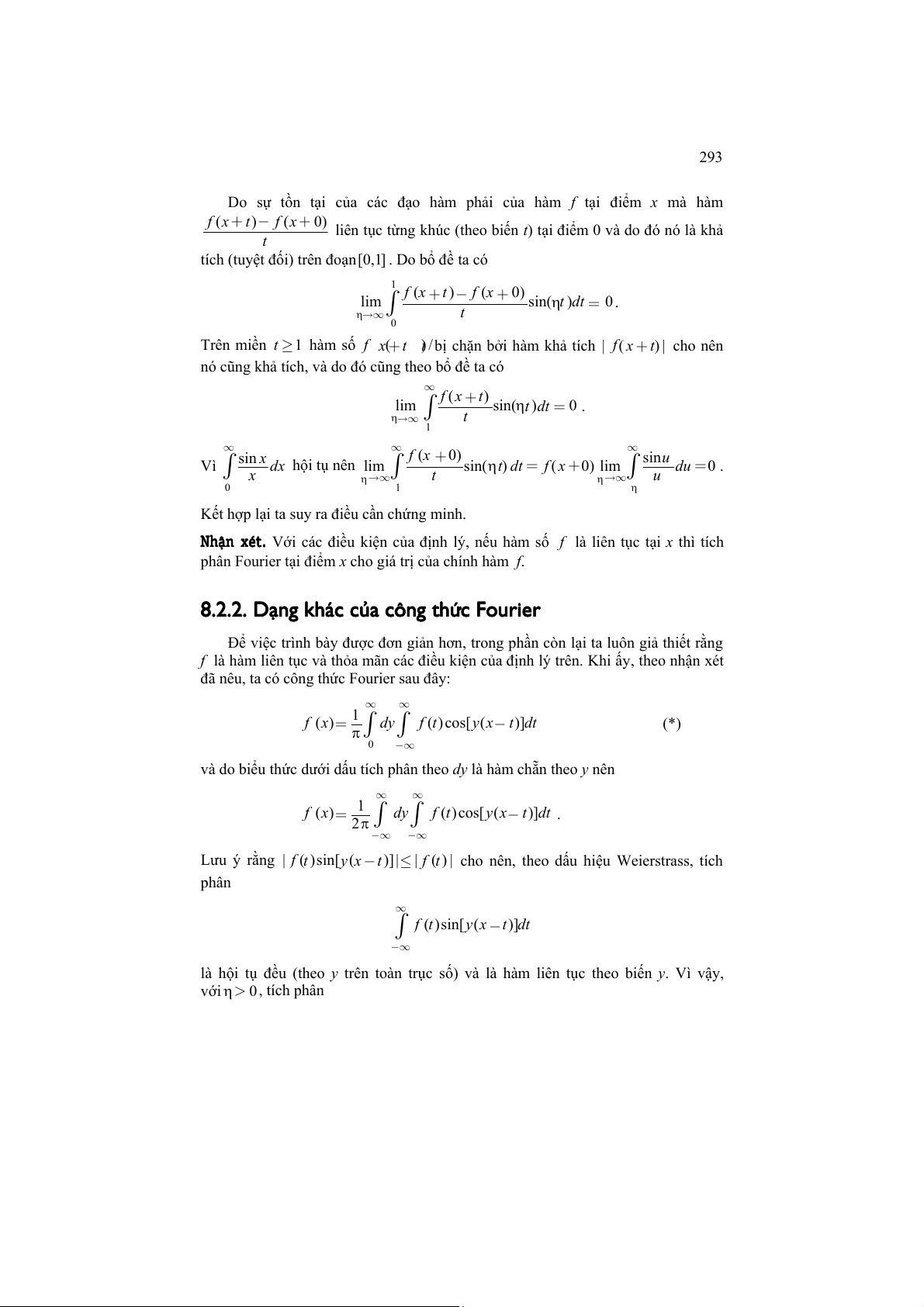 Lưu ý rằng | f (t )sin[y (x −t )] |≤ | f (t ) | cho nên, theo dấu hiệu Weierstrass, tích phân ∞