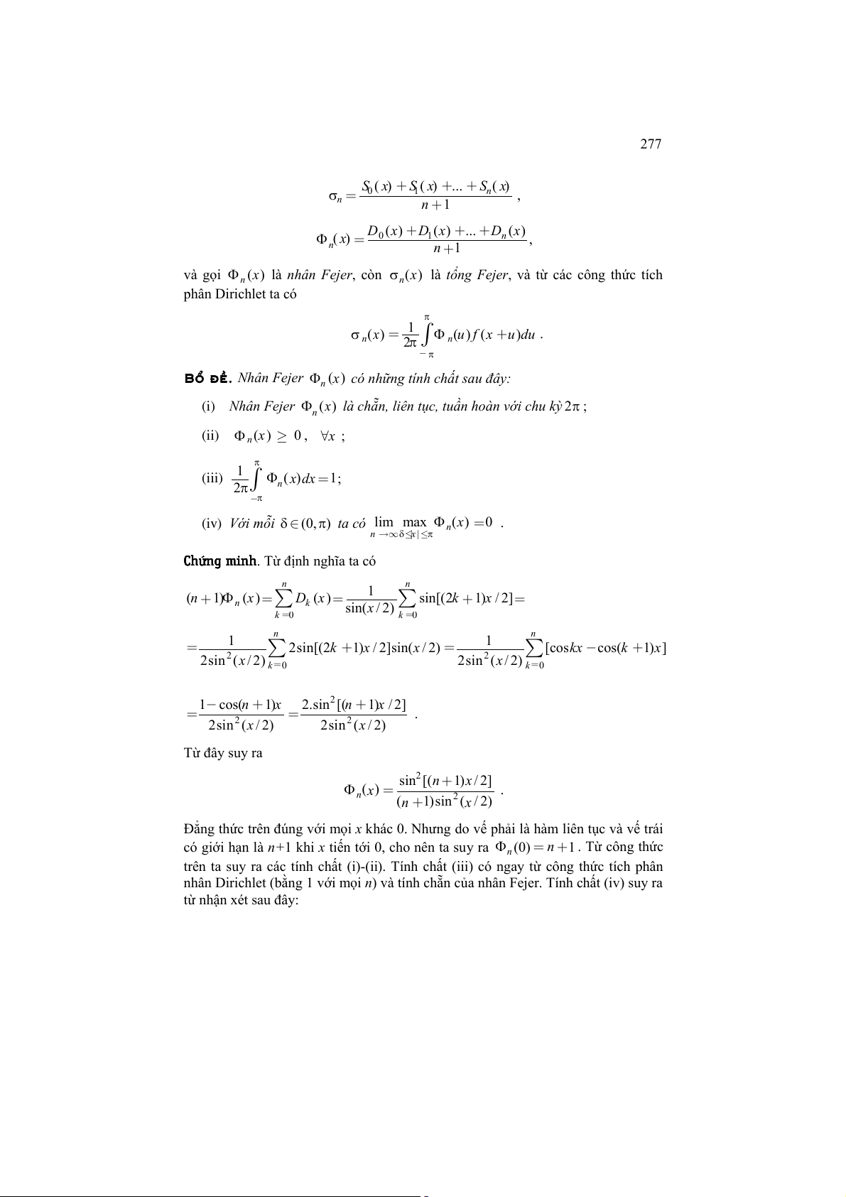 nhân Dirichlet (bằng 1 với mọi n) và tính chẵn của nhân Fejer. Tính chất (iv) suy ra từ nhận xét sau đây: 278