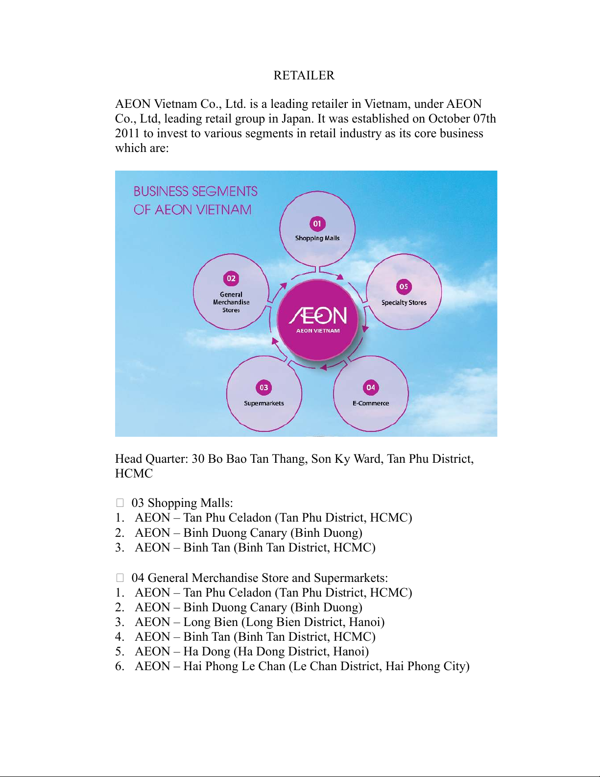 Head Quarter: 30 Bo Bao Tan Thang, Son Ky Ward, Tan Phu District, HCMC 03 Shopping Malls:
