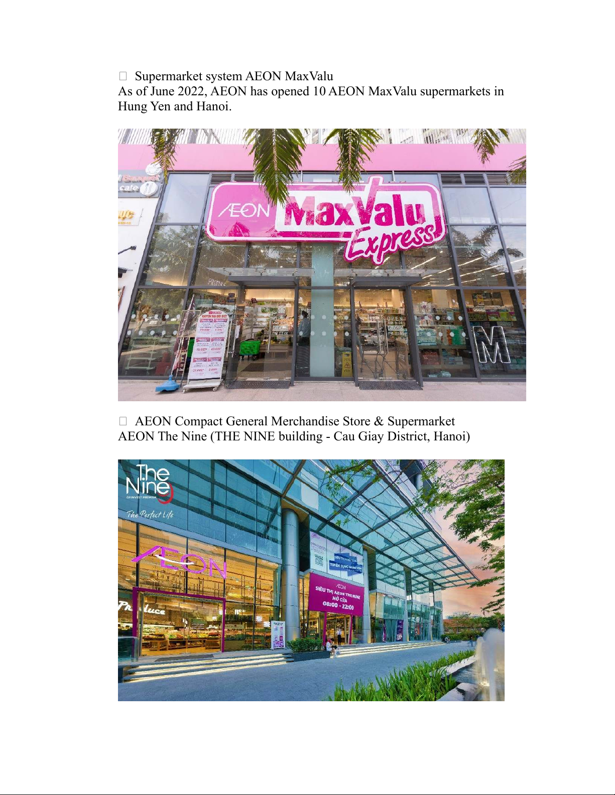 As of June 2022, AEON has opened 10 AEON MaxValu supermarkets in Hung Yen and Hanoi.