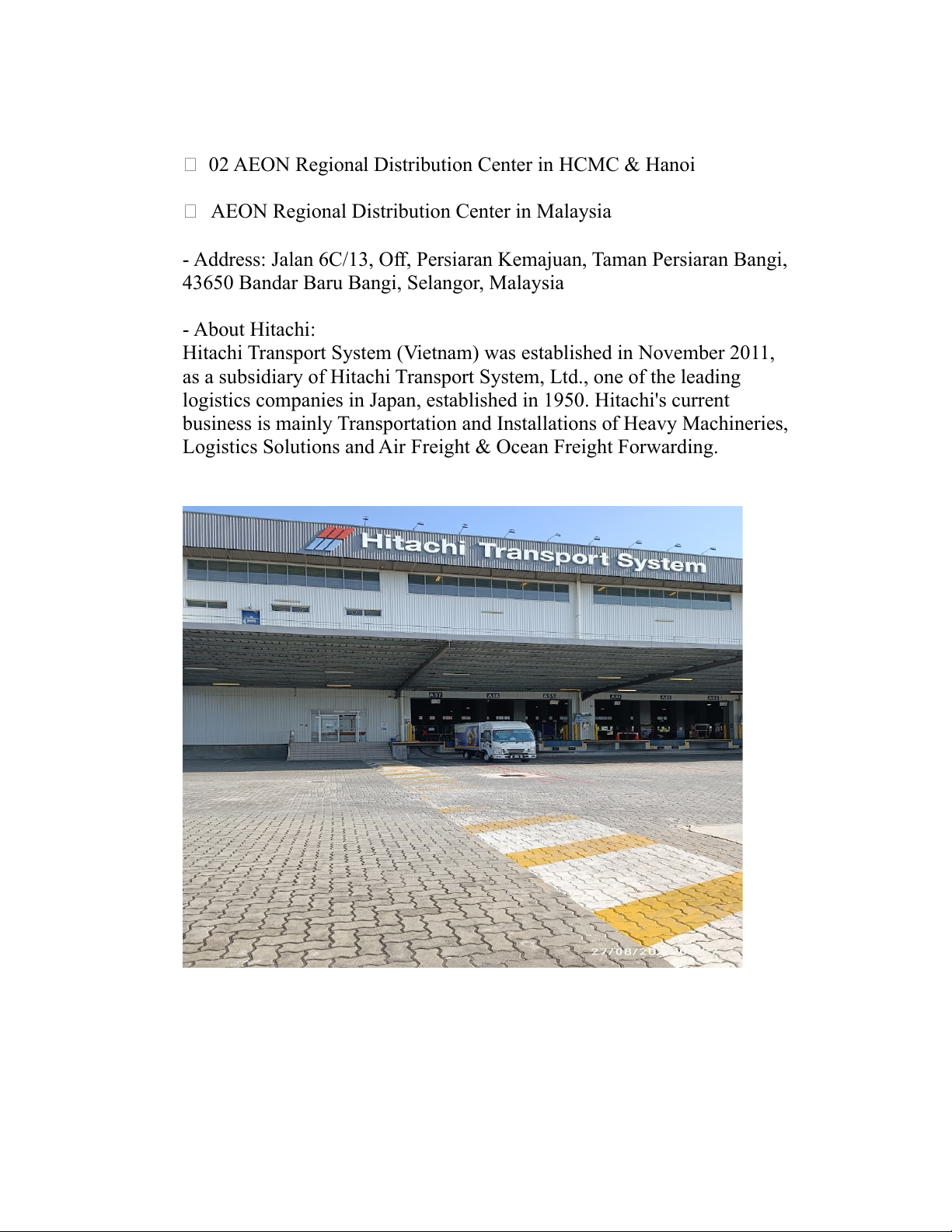 Hitachi Transport System (Vietnam) was established in November 2011,