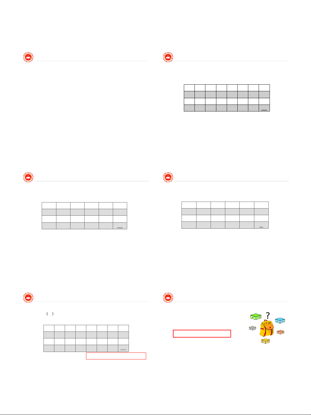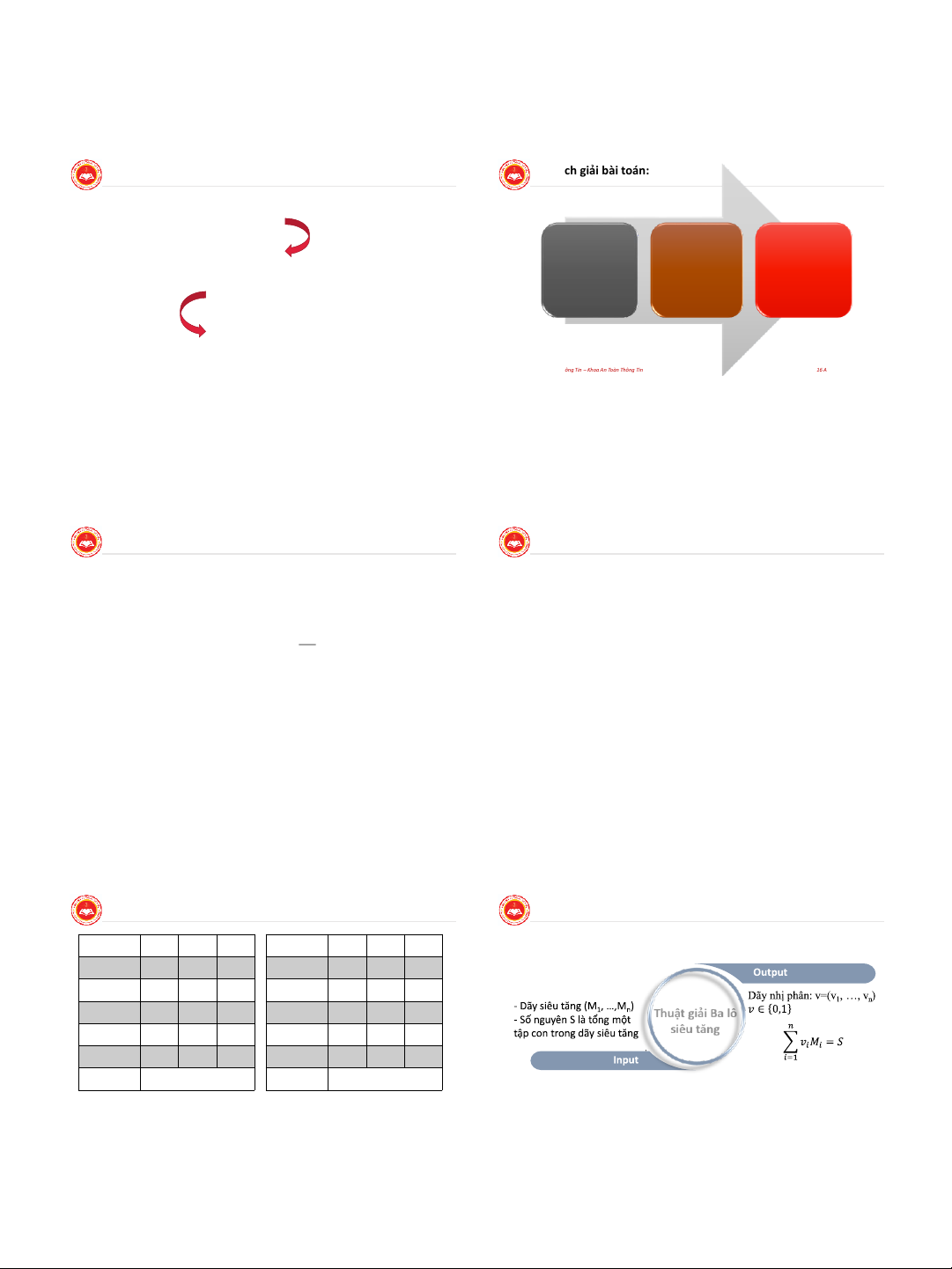 Thuật giải bài toán xếp ba lô trong trường hợp dãy siêu tăng: 96 -73 = 23 38? No 0 95 -73 = 22 38? No 0 23 17? Yes 1 22 17? Yes 1 23 – 17 = 6 11? No 0 22 – 17 = 5 11? No 0 Thuật giải Ba lô 6 4? Yes 1 5 4? Yes 1 siêu tăng 6 – 4 = 2 1? Yes 1 5 – 4 = 1 1? Yes 1 2 – 1 = 1 Không có lời giải 1 – 1 = 0 Có lời giải
