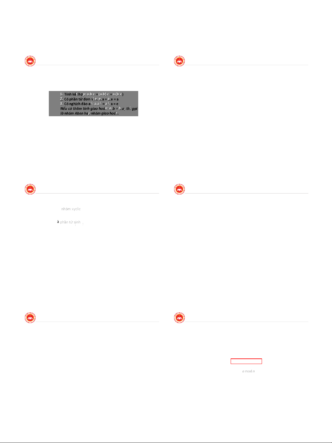 □ G được gọi là nhóm xyclic nếu nó chứa một phần tử a sao cho mọi phần