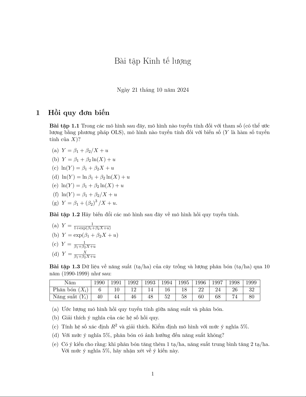 Bài tập 1.1 Trong các mô hình sau đây, mô hình nào tuyến tính đối với tham số (có thể ước