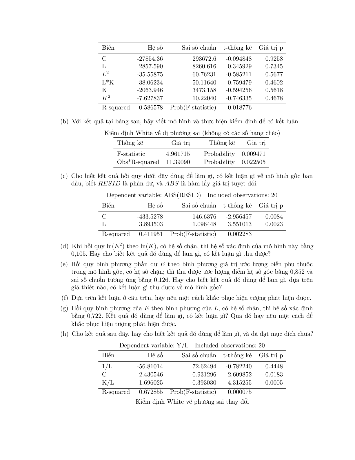 (j) Với bảng kết quả dưới đây, viết hồi quy phụ của kiểm định, thực hiện kiểm định và kết