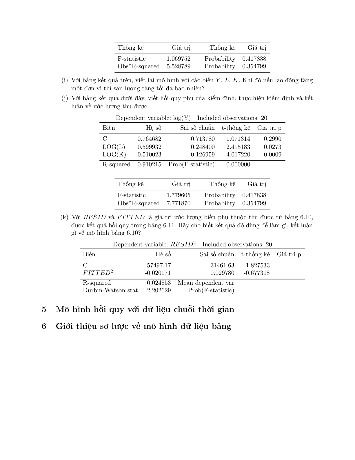 Dependent variable: log(Y) Included observations: 20 Biến Hệ số Sai số chuẩn t-thống kê Giá trị p C 0.764682 0.713780 1.071314 0.2990 LOG(L) 0.599932 0.248400 2.415183 0.0273 LOG(K) 0.510023 0.126959 4.017220 0.0009 R-squared 0.910215 Prob(F-statistic) 0.000000 Thống kê Giá trị Thống kê Giá trị F-statistic 1.779605 Probability 0.417838 Obs*R-squared 7.771870 Probability 0.354799