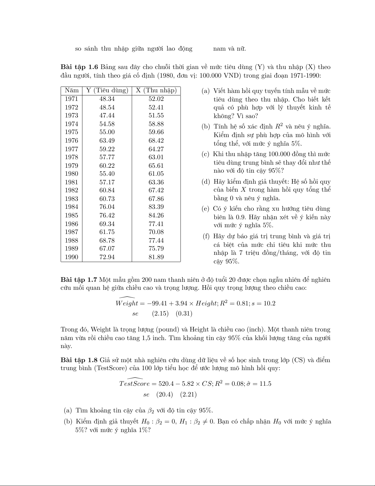 Bài tập 1.6 Bảng sau đây cho chuỗi thời gian về mức tiêu dùng (Y) và thu nhập (X) theo