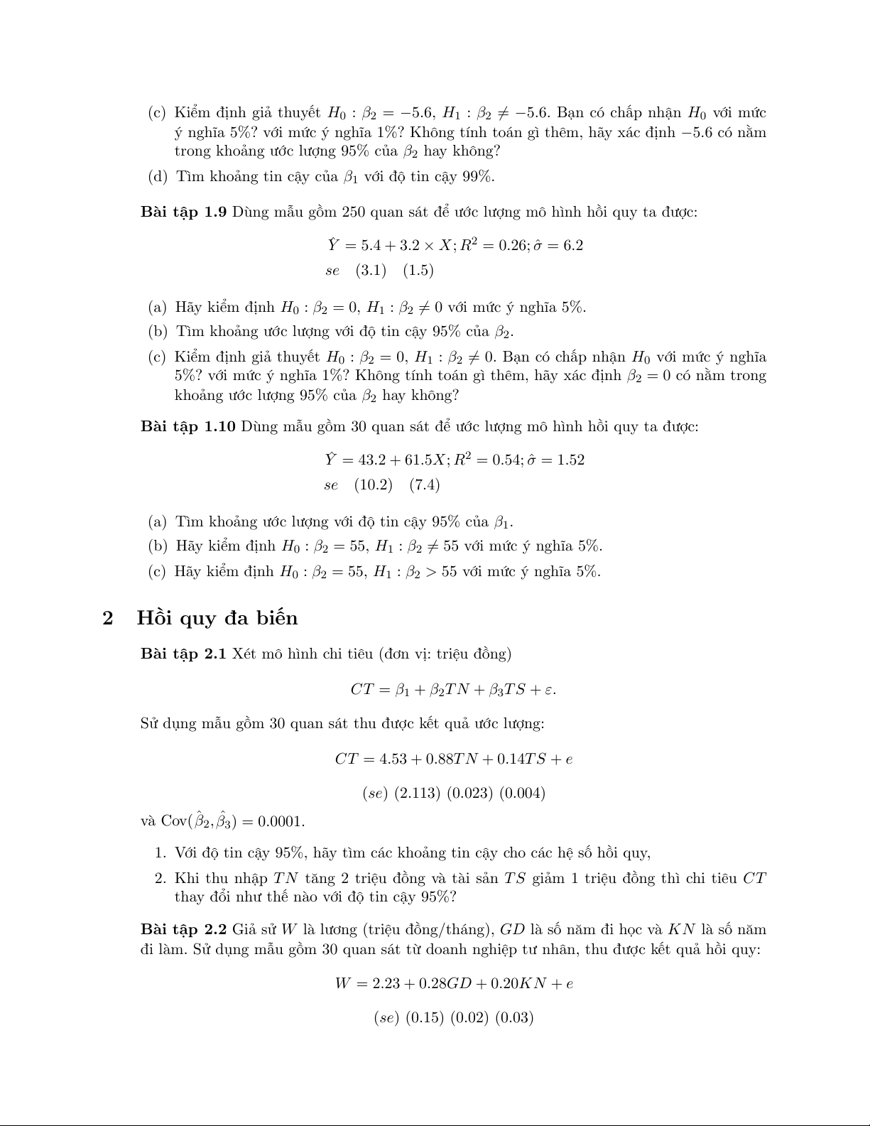 (c) Hãy kiểm định H0 : β2 = 55, H1 : β2 > 55 với mức ý nghĩa 5%. 2 Hồi quy đa biến