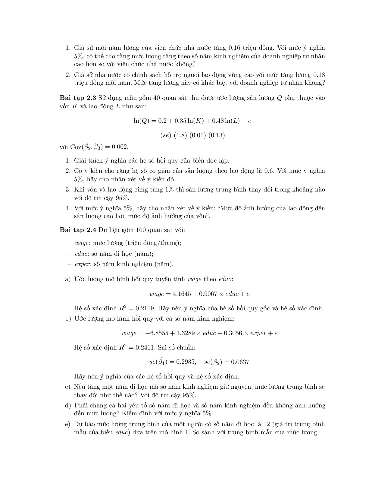 Bài tập 2.2 Giả sử W là lương (triệu đồng/tháng), GD là số năm đi học và KN là số năm