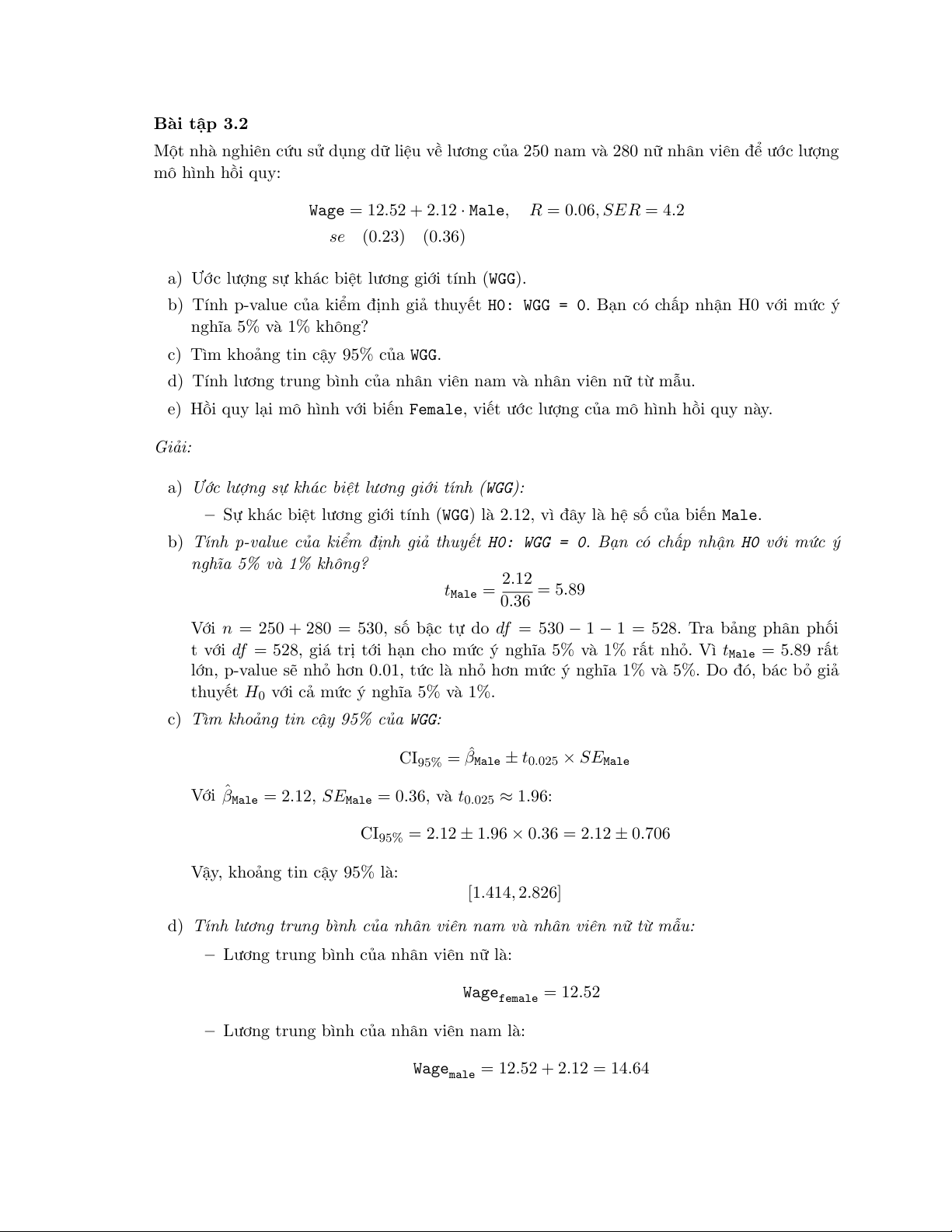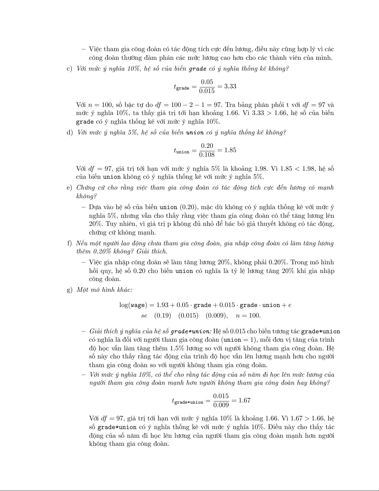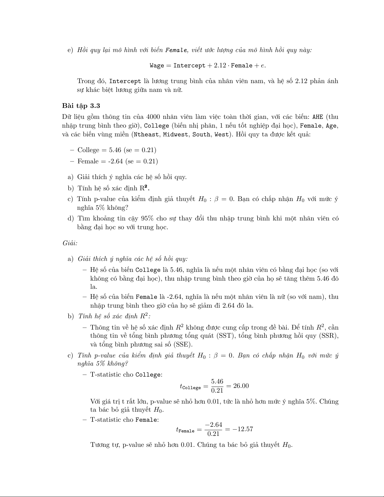 (b) Kiểm định giả thuyết H0 : β2 = 0, H1 : β2 = 0. Bạn có chấp nhận H0 với mức ý nghĩa 5%? với mức ý nghĩa 1%?