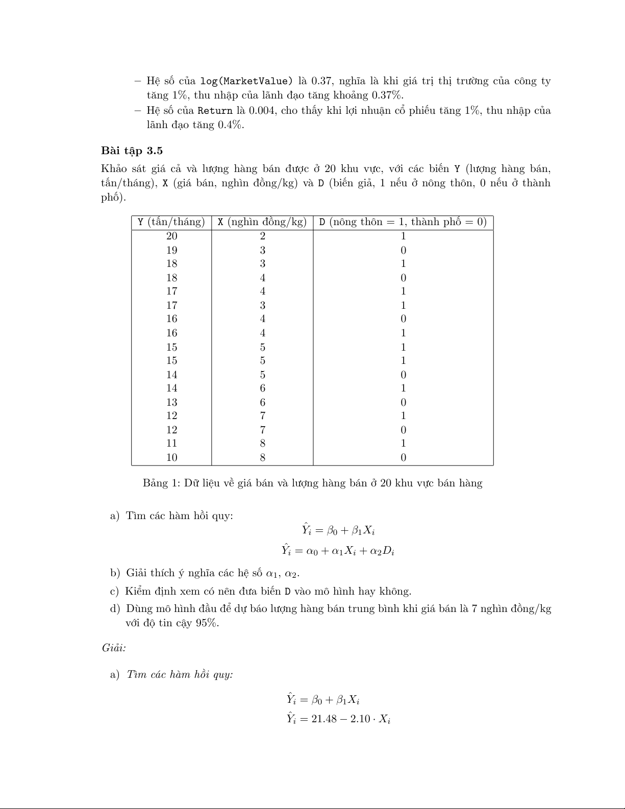 d) Dùng mô hình đầu để dự báo lượng hàng bán trung bình khi giá bán là 7 nghìn đồng/kg với độ tin cậy 95%. Giải: a) Tìm các hàm hồi quy: ˆ Yi = β0 + β1Xi ˆ Yi = 21.48 − 2.10 · Xi ˆ Yi = α0 + α1Xi + α2Di ˆ