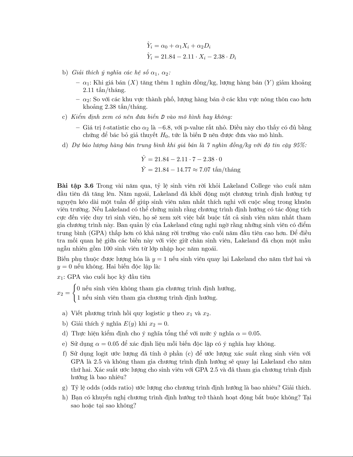 – α1: Khi giá bán (X) tăng thêm 1 nghìn đồng/kg, lượng hàng bán (Y ) giảm khoảng 2.11 tấn/tháng.