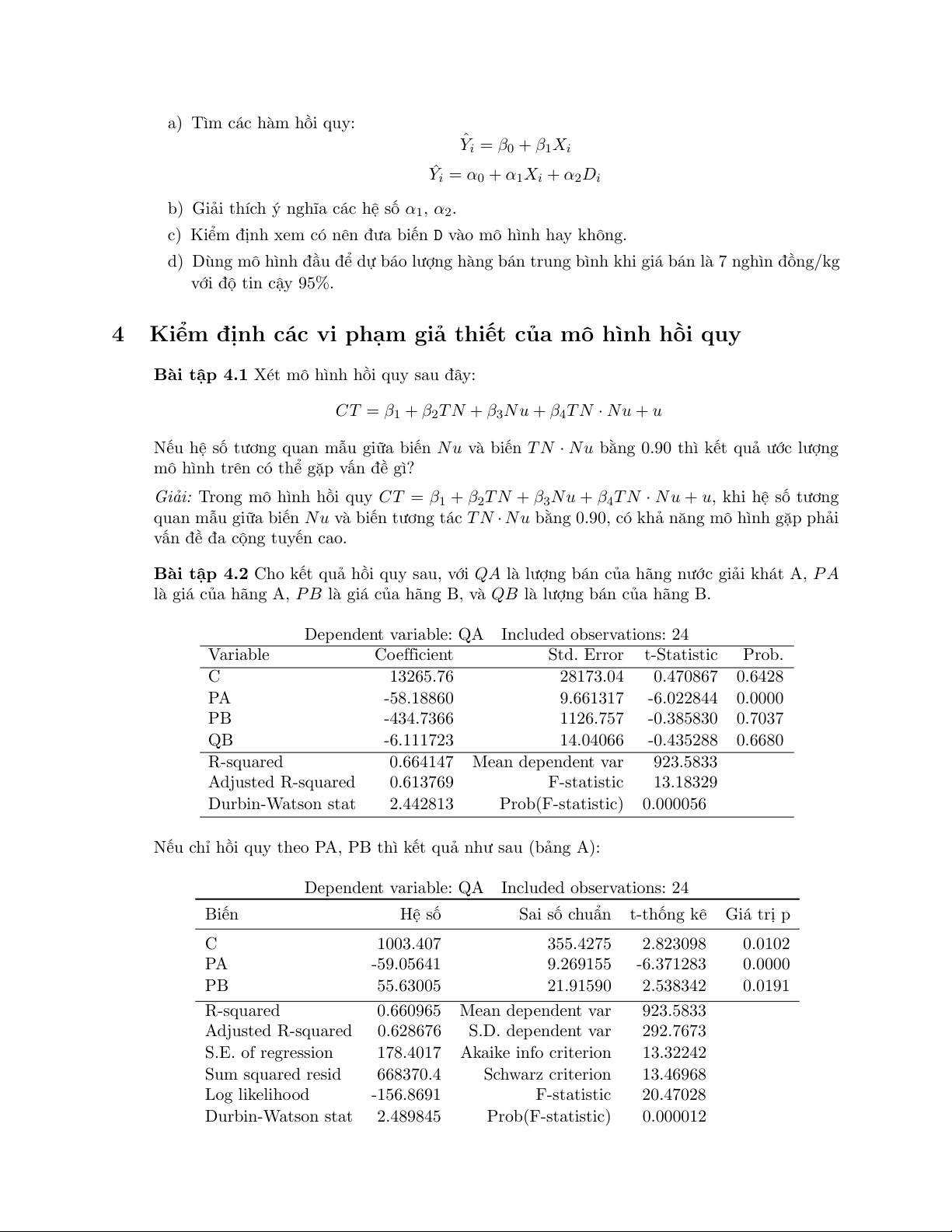 Bài tập 4.2 Cho kết quả hồi quy sau, với QA là lượng bán của hãng nước giải khát A, P A