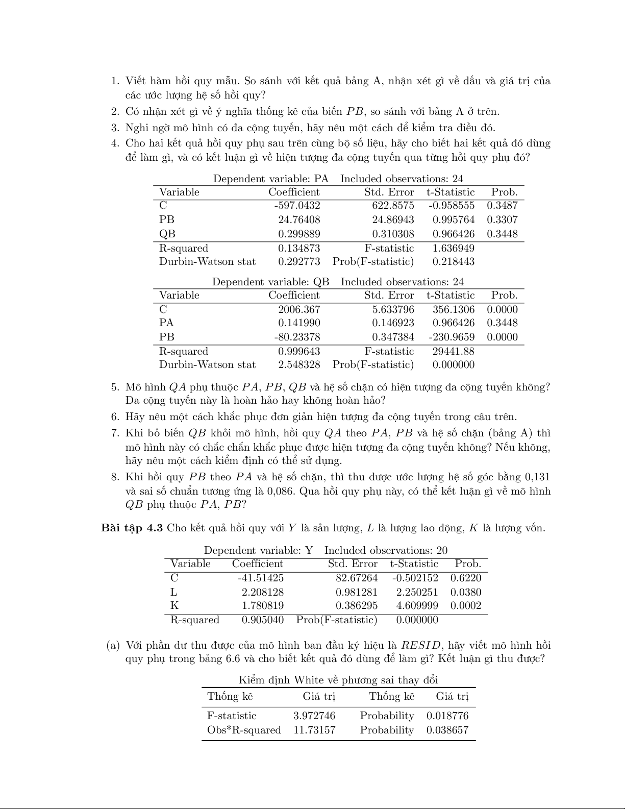 Bài tập 4.3 Cho kết quả hồi quy với Y là sản lượng, L là lượng lao động, K là lượng vốn.