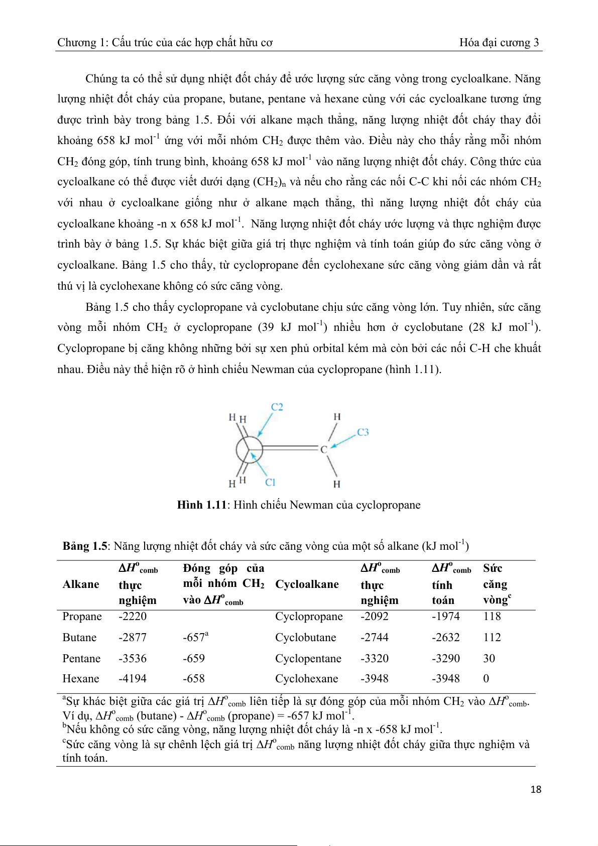 Bảng 1.5: Năng lượng nhiệt đốt cháy và sức căng vòng của một số alkane (kJ mol-1)