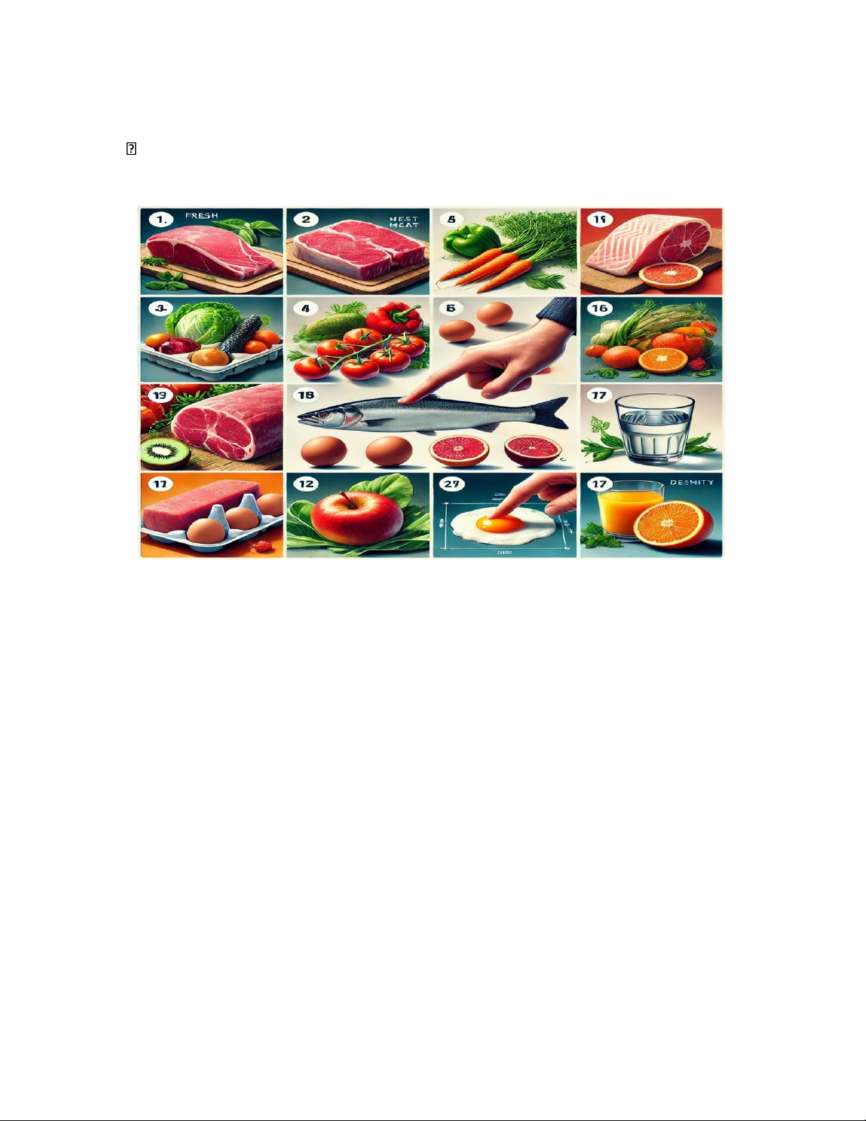 Ví dụ: thịt tươi có màu đỏ hồng, cá tươi có mang đỏ, rau củ tươi có màu sắc tự nhiên, sáng bóng.