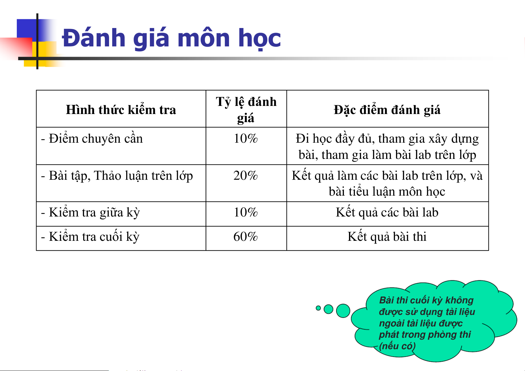 Kết quả làm các bài lab trên lớp, và bài tiểu luận môn học - Kiểm tra giữa kỳ 10% Kết quả các bài lab - Kiểm tra cuối kỳ 60% Kết quả bài thi