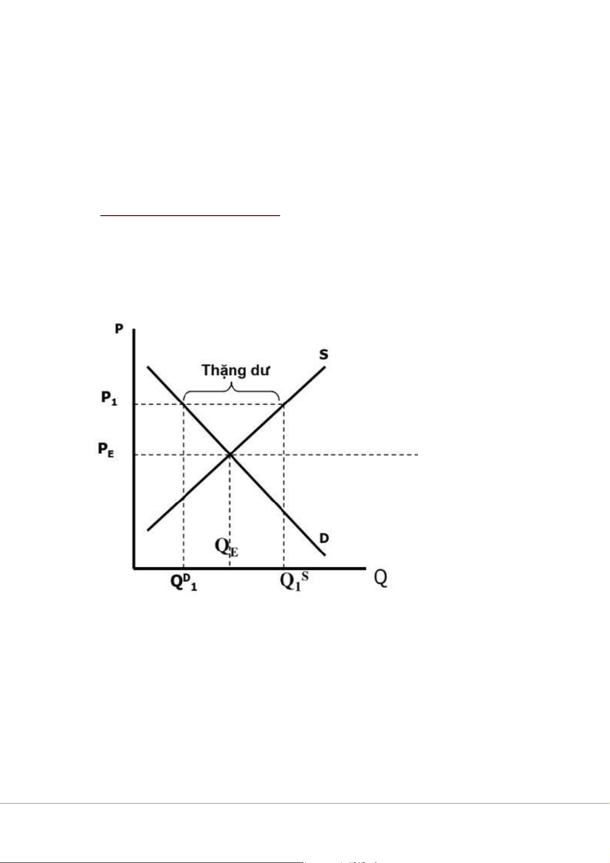 Dư thừa sẽ xuất hiện khi mức giá trên thị trường P1 lớn hơn giá cân bằng PE. P1>Pe( Giá cân bằng )