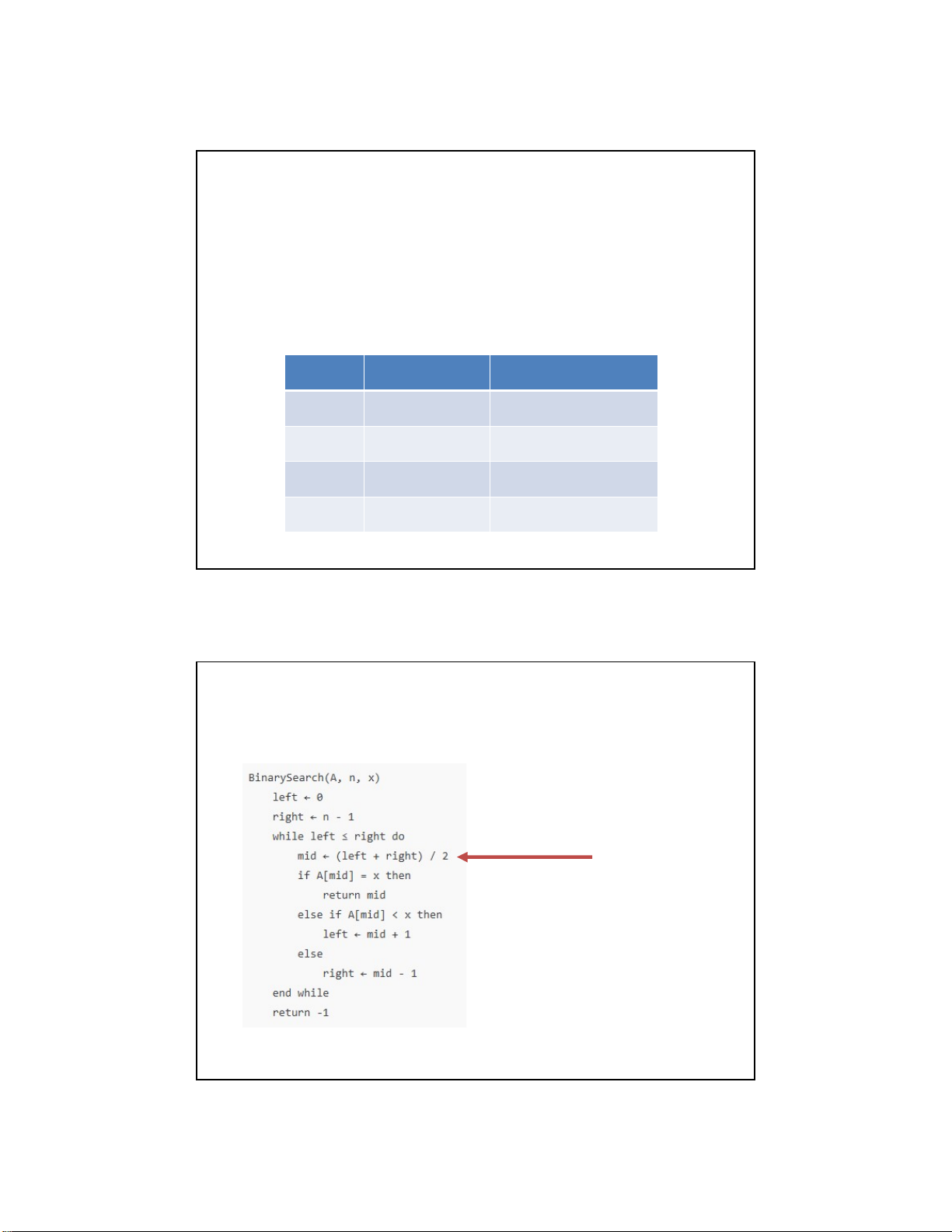 Có thể phải kiểm tra n phần tử Chậm khi n lớn while left ≤ right do mid ← (left + right) / 2 if A[mid] = x then return mid else if A[mid] < x then left ← mid + 1 else right ← mid - 1
