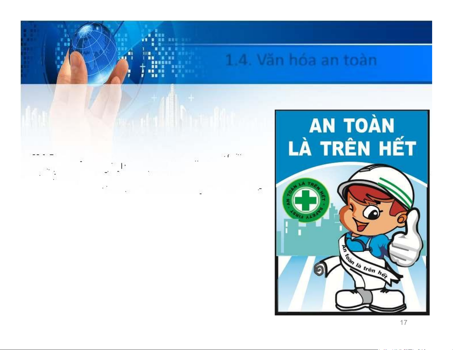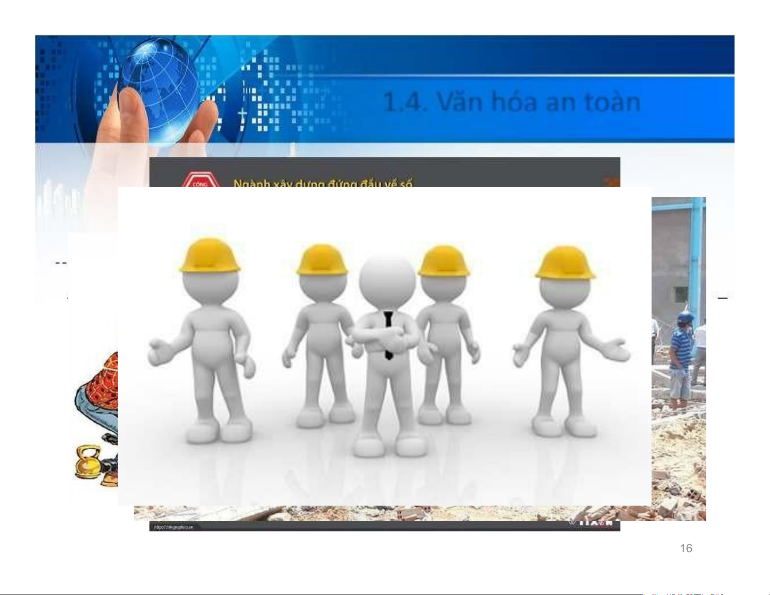 h ó ahọc ,,,, hiểmvàcóhại,cónguycơ YT gâyraTNLĐhoặcBNN NHĐH choNLĐ sinh vật tâm lý tư thế 14 lOMoAR cPSD| 39651089 • Điều kiệnlàm việctốt, thuận lợi/có hại, bất lợi? • Môi trườnglàm việcthuận lợi/độc hại? 15 lOMoAR cPSD| 39651089 1.4 . Vănhóaan toàn 16 lOMoAR cPSD| 39651089 1.4 . Vănhóaan toàn