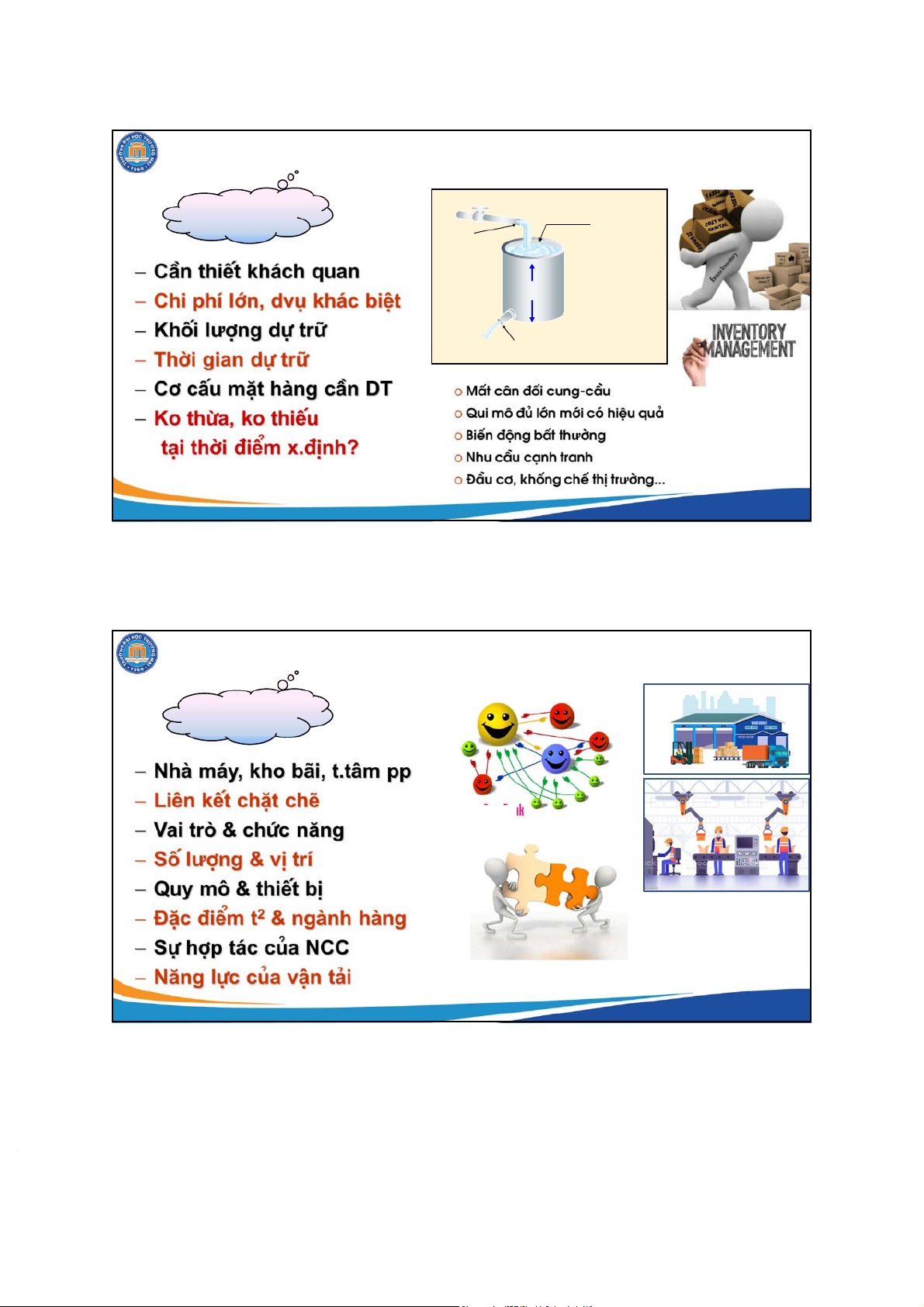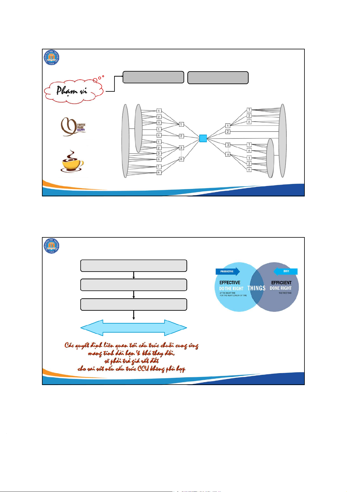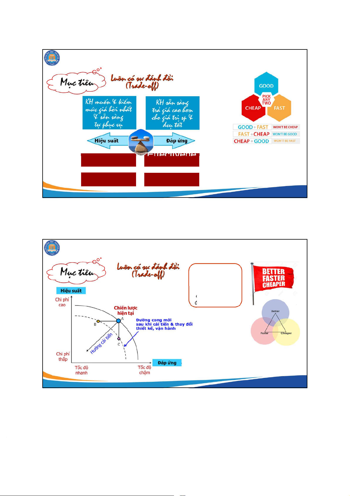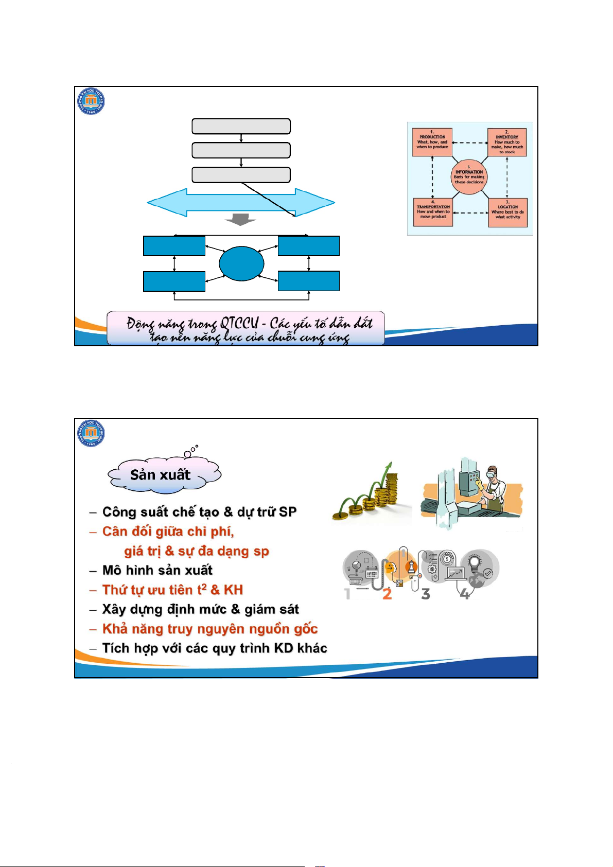 Tiện lợi kém ▪Tốc độ… eness ▪Tốc độ… 1. 1 2 . . 2 1 . 1 K h K á h i á in i n ệ i m ệ , m ,m . m ti . ê ti u ê u v à v à b ả b n ả n c h c ấ h t ấ Q t T Q C T C C U C U 36 Đường cong hiệu suất-đáp ứng cho biết điểm CP thấp nhất để được mức độ đáp ứng xác định 18 21/8/2024 1. 1 2 . . 2 2 . 2 C á C c á c n h n â h n â n tố tố đ ộ đ n ộ g n g n ă n n ă g n g tr o tr n o g n g Q T Q C T C C U C U 37 Chiến lược cạnh tranh CL chuỗi cung ứng Cấu trúc chuỗi cung ứng CHI PHÍ Hiệu suất Mức độ đáp ứng ĐÁP ỨNG Sản xuất Dự trữ Thông Vận tin Địa điểm chuyển 1. 1 2 . . 2 2 . 2 C á C c á c n h n â h n â n tố tố đ ộ đ n ộ g n g n ă n n ă g n g tr o tr n o g n g Q T Q C T C C U C U 38 Sản xuất 19 21/8/2024 1. 1 2 . . 2 2 . 2 C á C c á c n h n â h n â n tố tố đ ộ đ n ộ g n g n ă n n ă g n g tr o tr n o g n g Q T Q C T C C U C U 39 Dự trữ Mức dự trữ Tốc độ cung ứng Đệm lót, giảm xóc cho dao động Mức dự trữ giữa cung ứng & tiêu thụ Tốc độ tiêu thụ 1. 1 2 . . 2 2 . 2 C á C c á c n h n â h n â n tố tố đ ộ đ n ộ g n g n ă n n ă g n g tr o tr n o g n g Q T Q C T C C U C U 40 Địa điểm 20