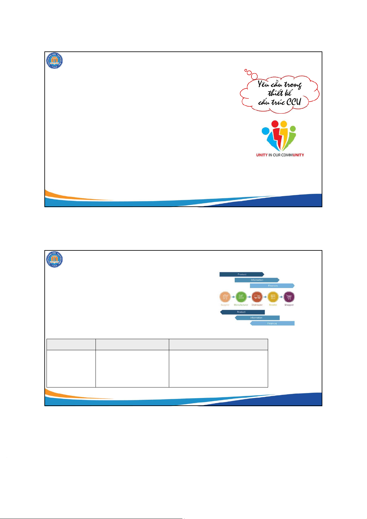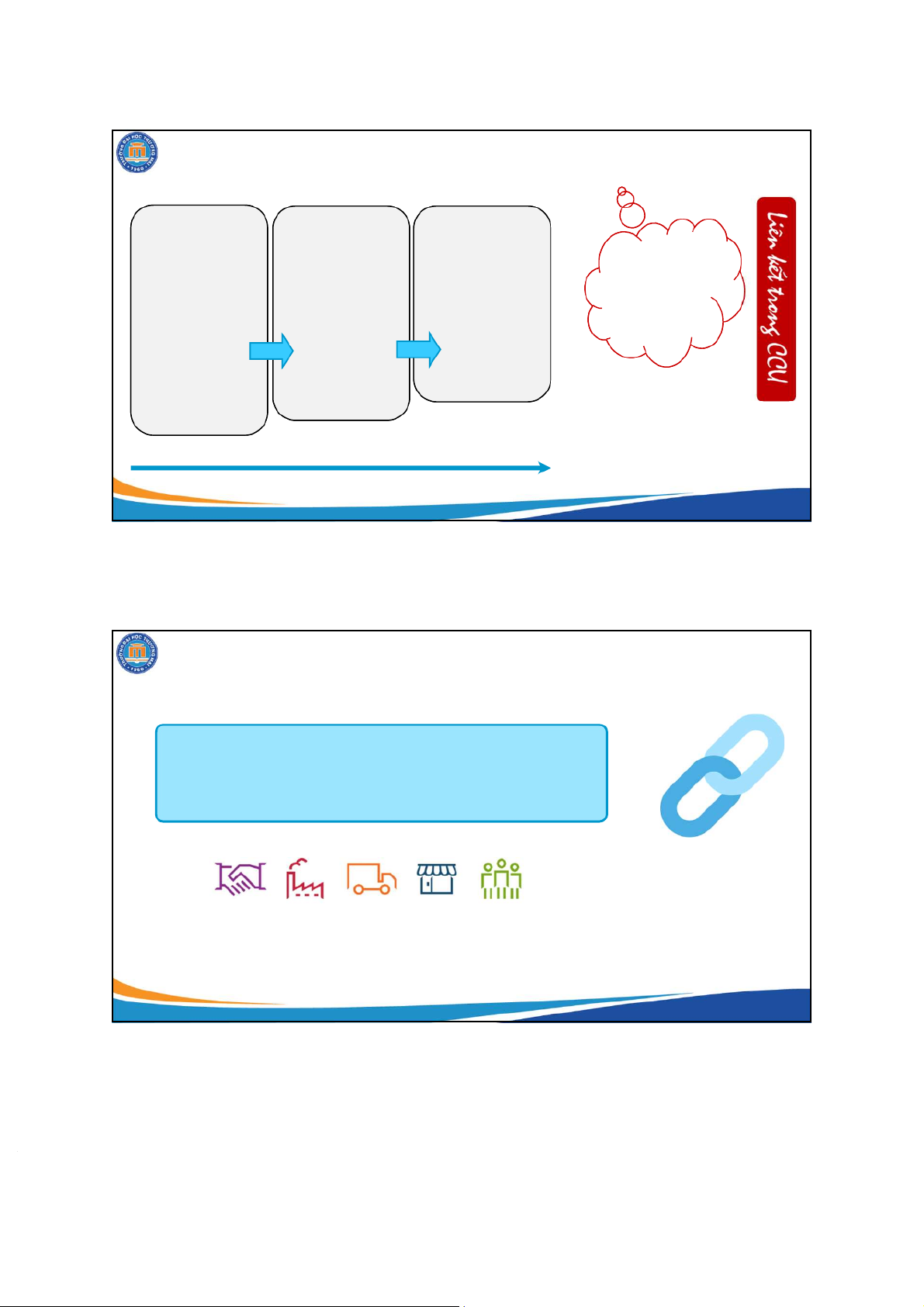 ▪Thương lượng, đàm phán 13 21/8/2024 1. 1 1 . . 1 3 . 3 C á C c á c d ò d n ò g n g c h c ả h y ả y v à v à l ilê i n ê n k ế k t ế tr t o tr n o g n g C C C U C 27 CHIA SẺ CHIA SẺ CHIA SẺ •Dữ liệu •Ph.tiện logistics •Đơn hàng Các mối •Thông tin •Kho bãi, TTPP •Quyền lực t2 •Tuyến đường •Quá trình hỗ trợ quan hệ •Kinh nghiệm liên kết có thể MỤC ĐÍCH MỤC ĐÍCH MỤC ĐÍCH Bậc tác nghiệp Bậc chiến thuật Bậc chiến lược chia làm 3 bậc •Chi phí giảm •Cộng tác đa chiều •Đổi mới •Đáp ứng nhanh •Tối ưu hóa •Tăng trưởng tương đối •Năng suất tăng nguồn lực •Gia tăng giá trị •Nhóm mua •Giảm rủi ro CCU •Cải thiện vị thế •Nhóm phân phối •PT bền vững •Dịch vụ KH