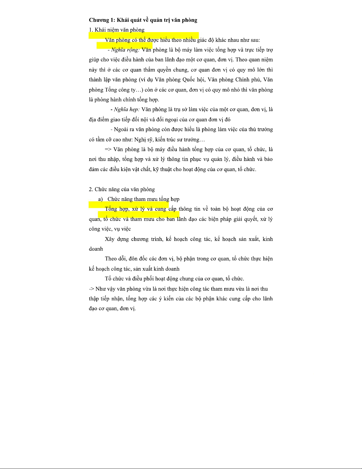 Chương 1: Tổng Quan về Quản Trị Văn Phòng - Cuối Kỳ 2023