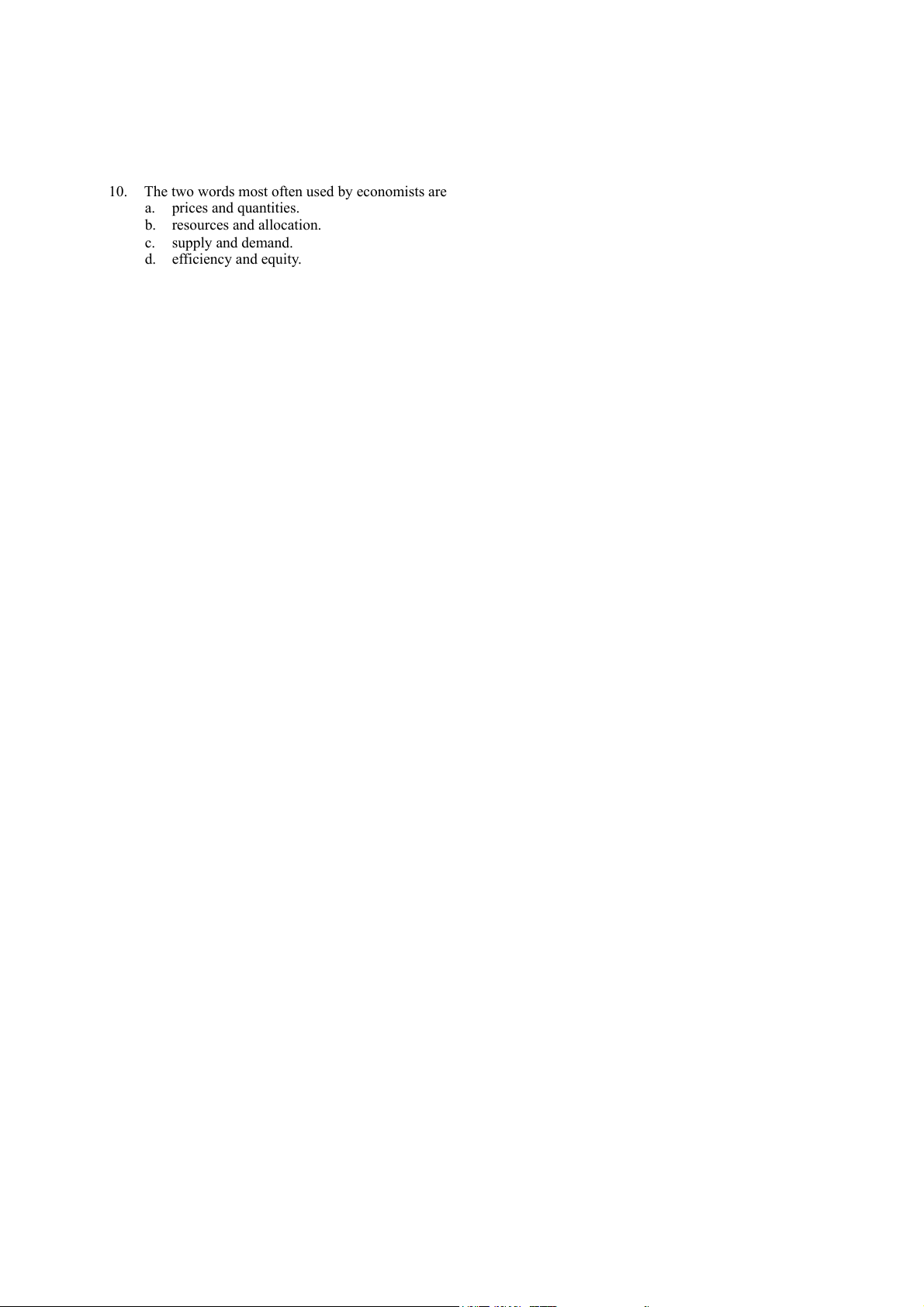10. The two words most often used by economists are a. prices and quantities. b. resources and allocation. c. supply and demand. d. efficiency and equity. 11.