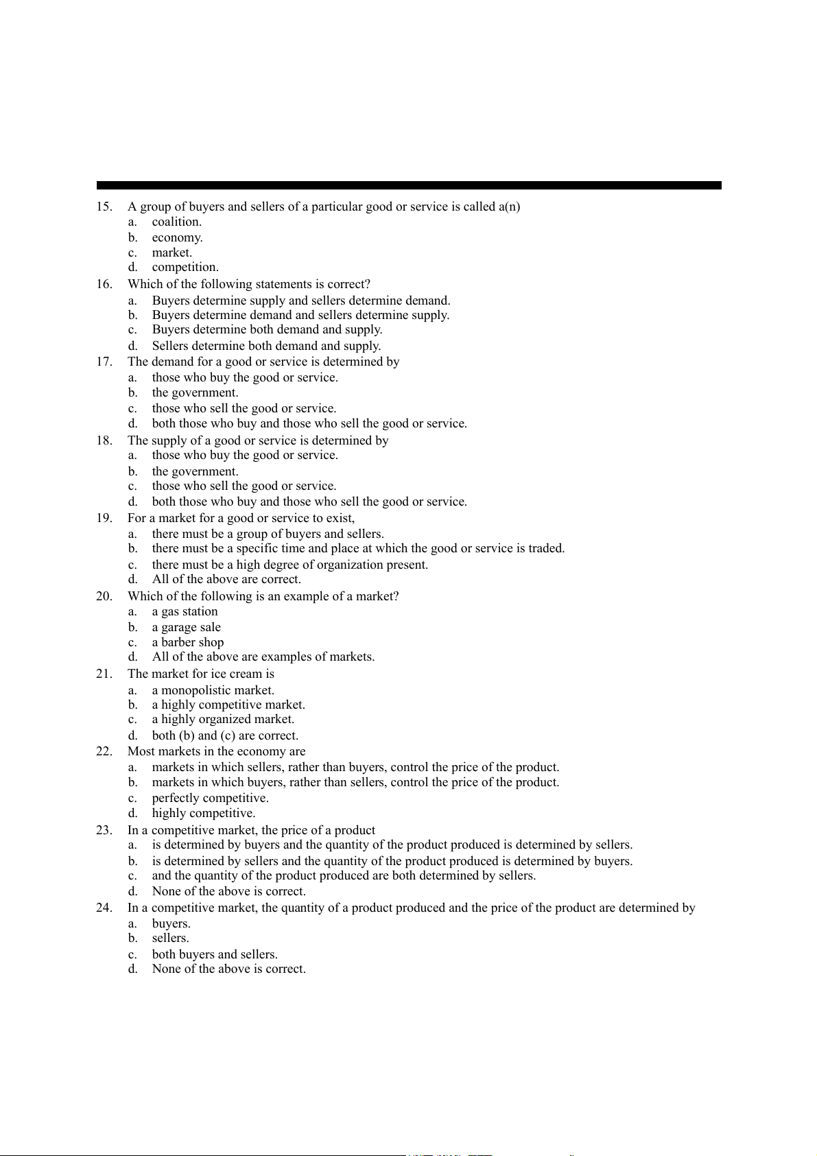 15. A group of buyers and sellers of a particular good or service is called a(n) a. coalition. b. economy. c. market. d. competition.